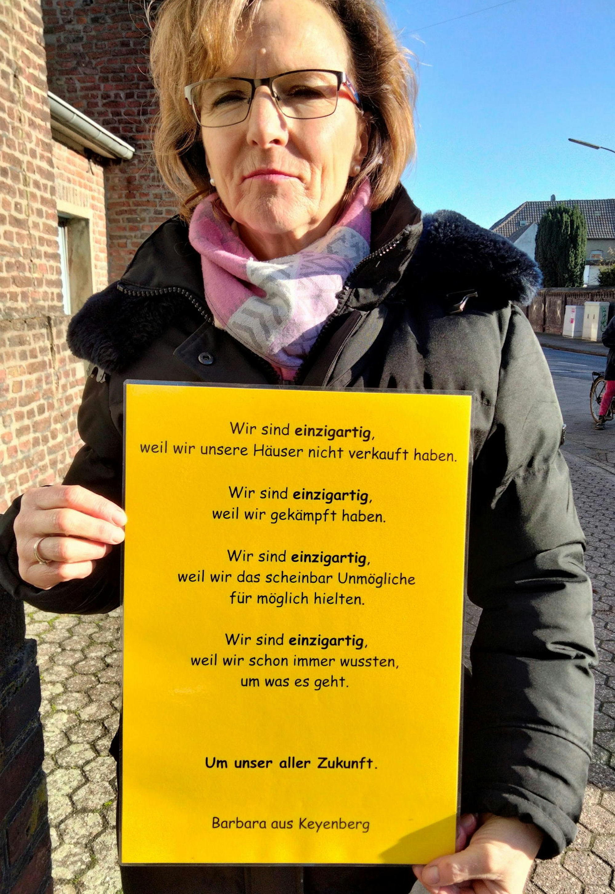 Rhein-Erft-Kreis/Keyenberg – „Wir sind einzigartig, weil wir das scheinbar Unmögliche für möglich hielten. Wir sind einzigartig, weil wir schon immer wussten, um was es geht. Um unser aller Zukunft.“ Diese Zeilen hatte Barbara Ziemann-Oberherr auf ein Schild geschrieben, das sie vor sich her trug, um gegen die Entwidmung der Heilig-Kreuz-Kirche in Keyenberg zu protestieren.