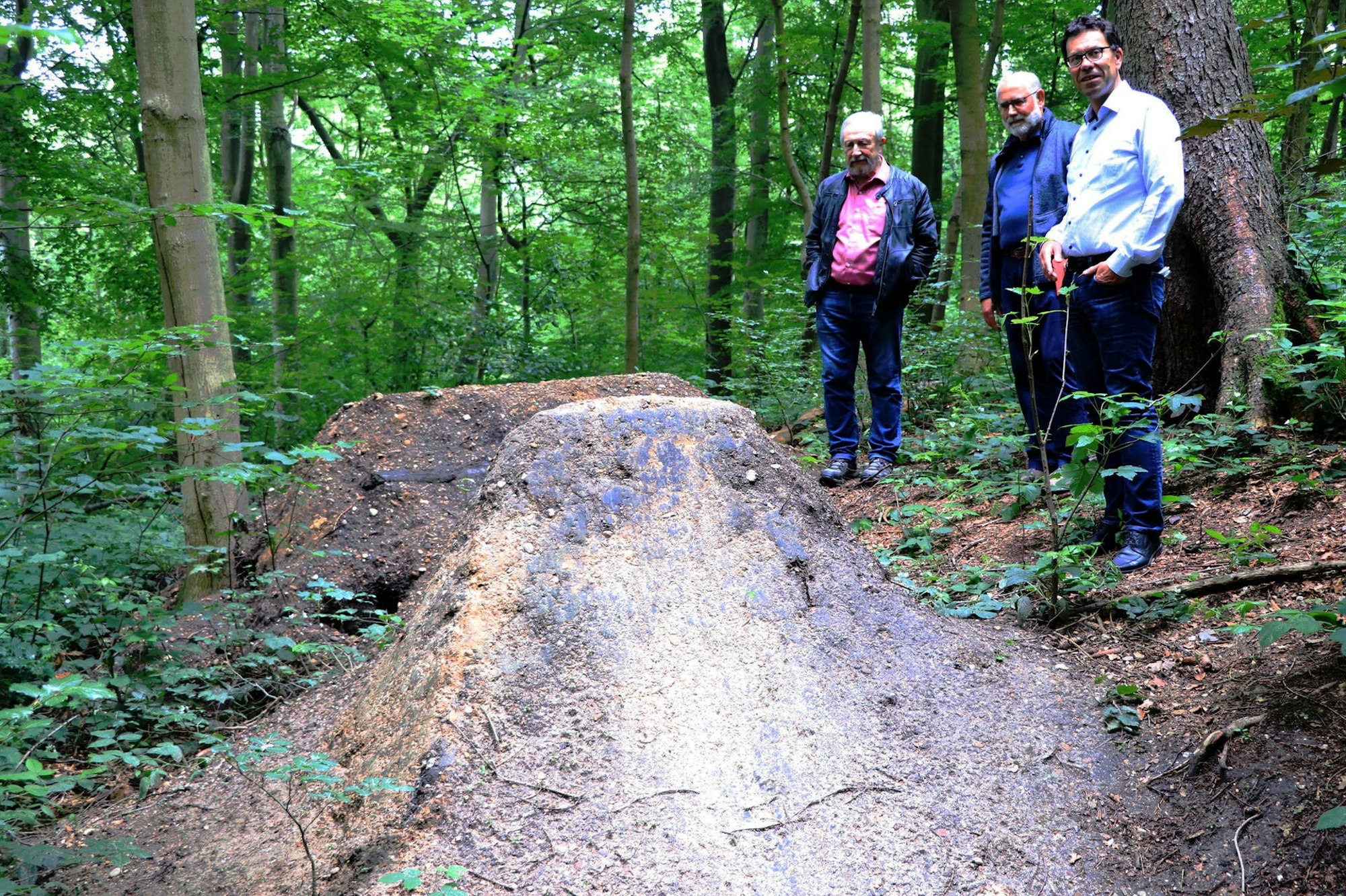 SPD-Kreis-Fraktionsvorsitzender Dierk Timm, die Kreistagsabgeordneten Hans Günter Eilenberger und Daniel Dobbelstein sowie das Pulheimer Ratsmitglied Harald Thomas waren der Einladung der Waldfreunde gefolgt und zeigten sich bestürzt und schockiert über das enorme Ausmaß an wild angelegten Trails, Kurven und Sprungschanzen, die die Mountainbiker in dem hügeligen Gelände errichtet haben und nutzen.