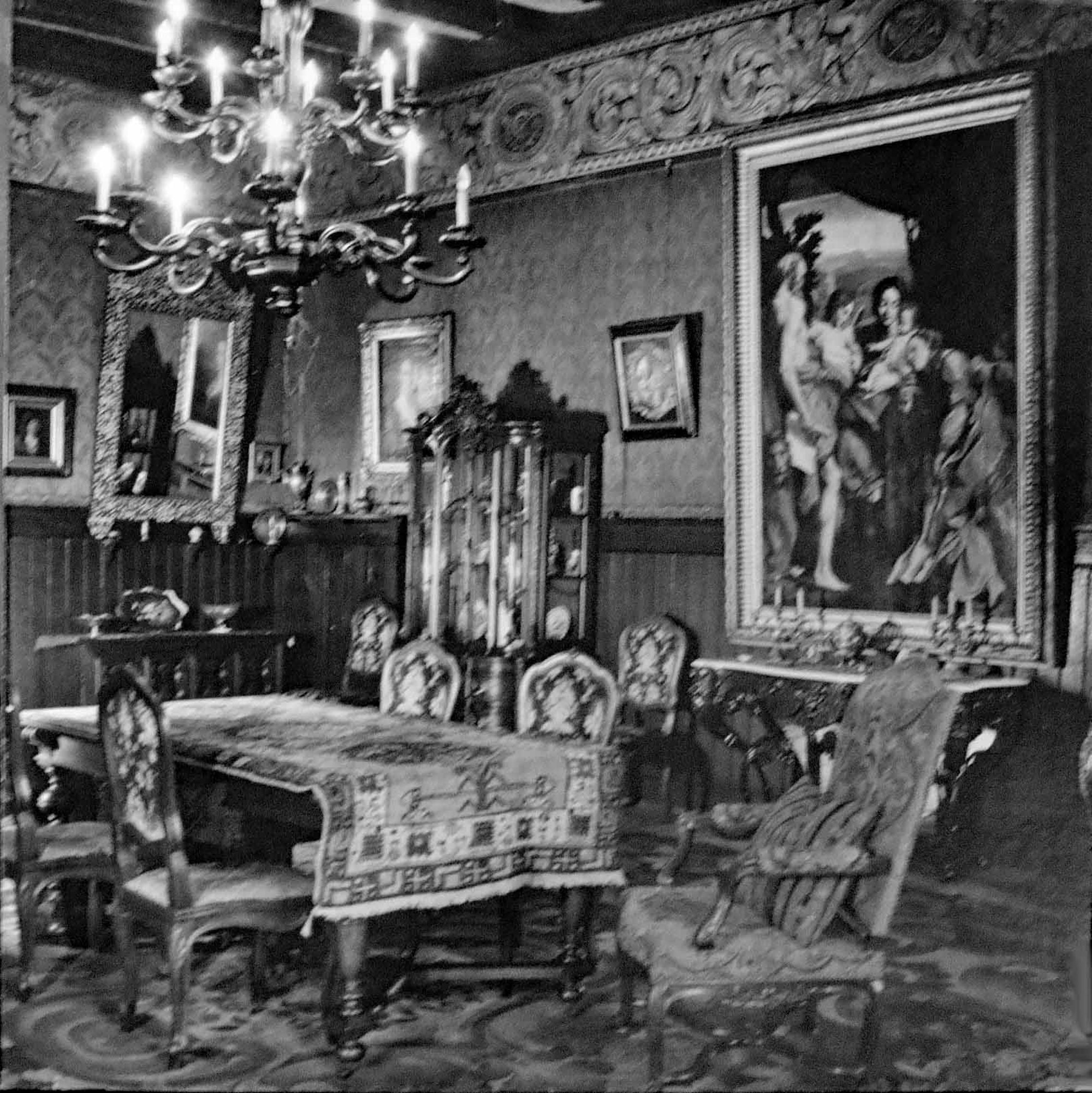 Die beiden Wohnräume im Anbau von 1632 wurden zur Bibliothek mit einem englischen Sandsteinkamin und zum Rittersaal ausgebaut, der dazwischen liegende Flur der Bibliothek zugeschlagen und die Verbindungstüren so weit vergrößert, dass beide Räume auch zusammen genutzt werden können.