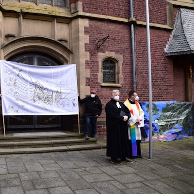 Aktivisten haben am Dienstag vor der Staatskanzlei mit einem Greenpeace-Banner mit der Aufschrift „Armin Laschet will Klima und Dörfer zerstören!“ und einem gelben Kreuz gegen den Braunkohleabbau demonstriert.