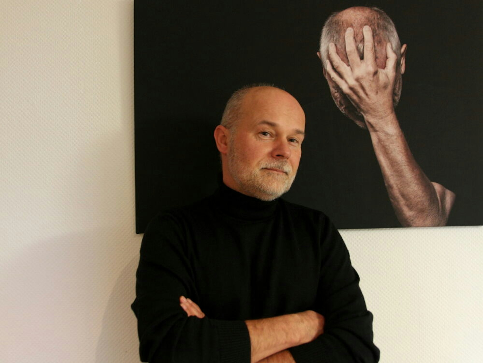Fotograf Manfred Jasmund vor einem Selbstporträt.