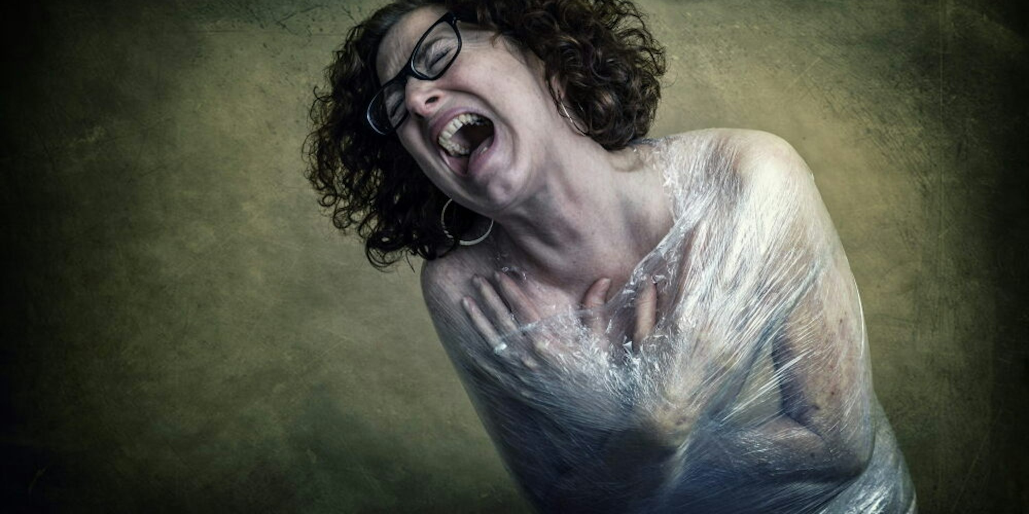 Claudia hat das Gefühl, in sich gefangen zu sein. Fotograf Jasmund symbolisierte das, indem er sie in Folie wickelte.