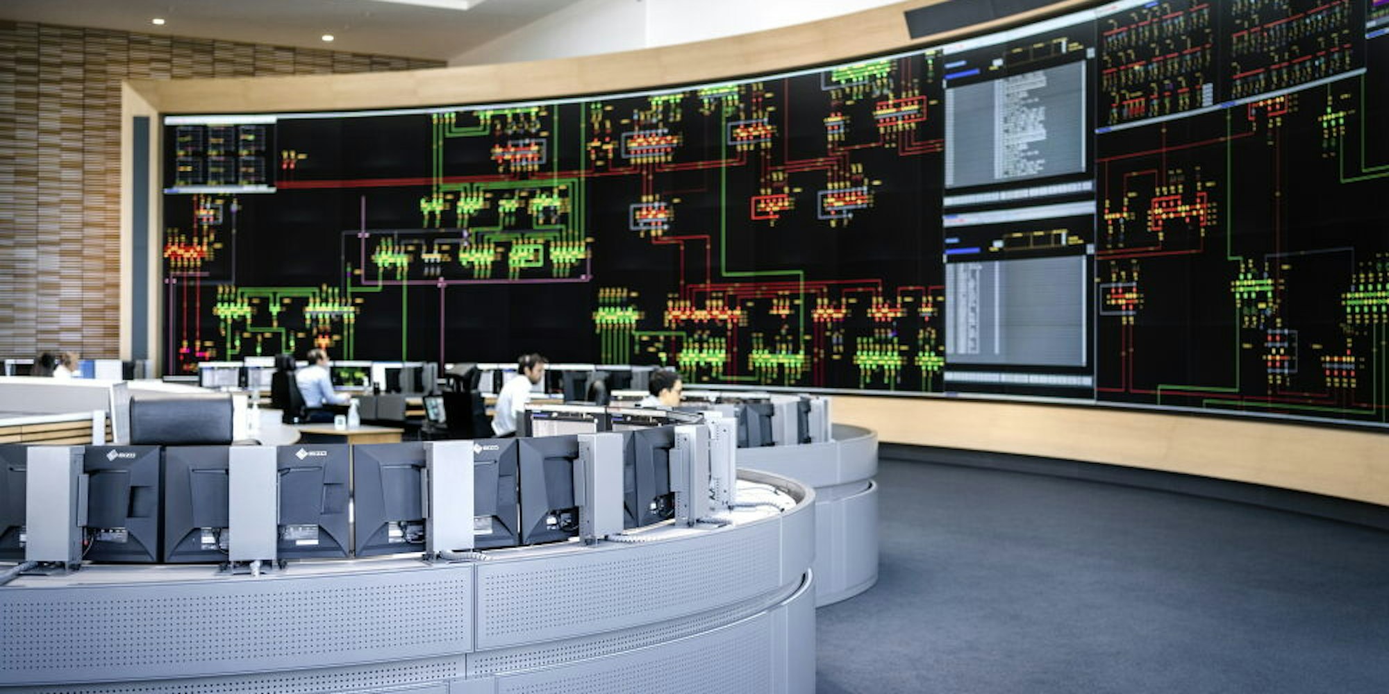 Künstliche Intelligenz und zwei hochmoderne Rechenzentren: „Die Hauptschaltleitung ist das Gehirn der Energiewende“, formuliert Neumann. Er schiebt gleich noch einen Superlativ hinterher: Die Großbildanzeige habe eine Fläche von 108 Quadratmetern und sei damit die größte in Europa und die drittgrößte der Welt.