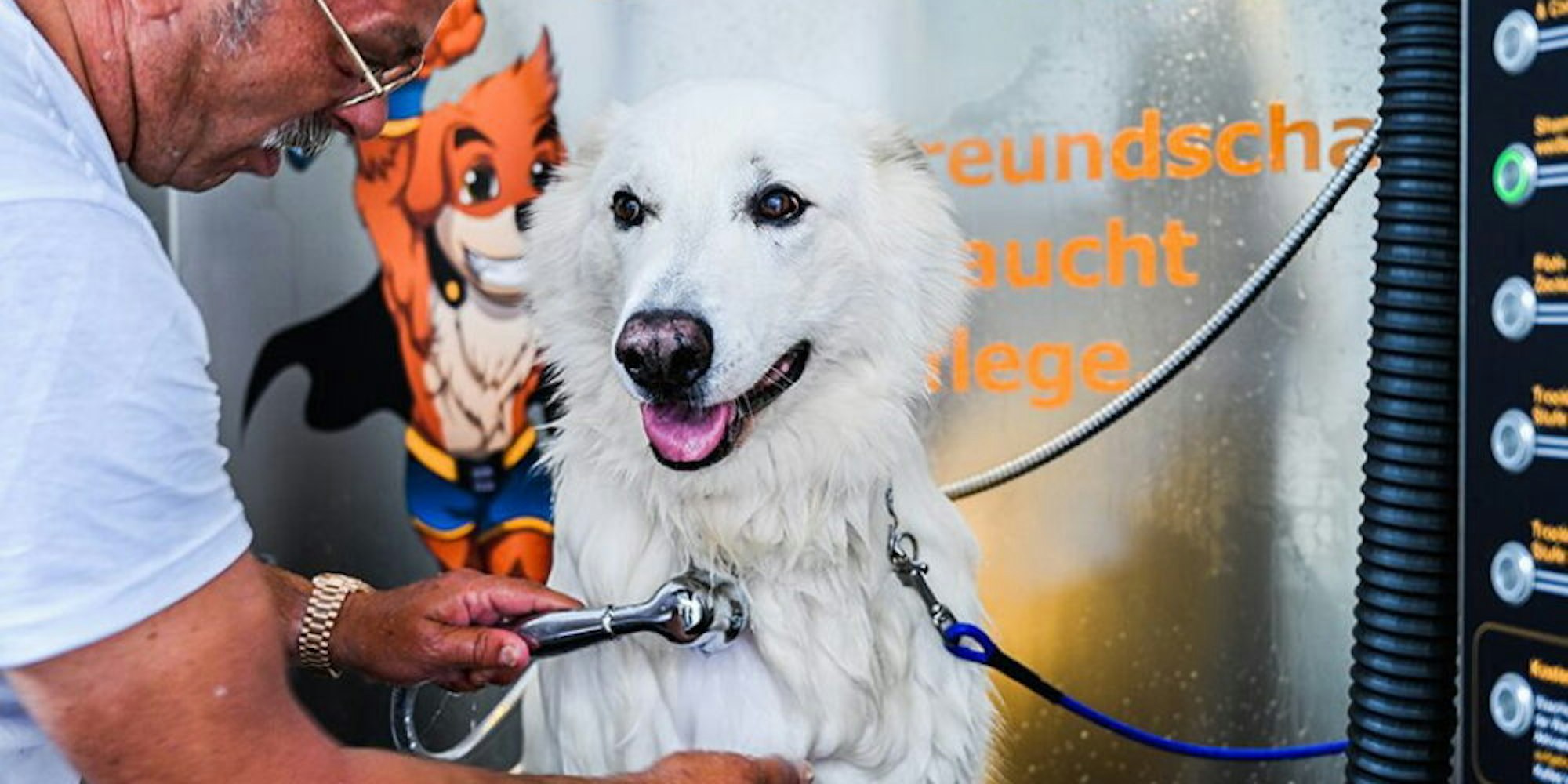 Das Prozedere ist denkbar simpel. „Einfach den Hund über die Rampe in die Wanne führen, Geld einwerfen, das Wunsch-Programm starten, und schon kann die Hundewäsche beginnen“, sagt Antonio Kubina. Der 20-Jährige, der im elterlichen Autohaus – im Kubina Car Center – eine Ausbildung zum Automobilkaufmann macht, ist der „Waschboxen-Beauftragte“, wie er mit einem Augenzwinkern formuliert.