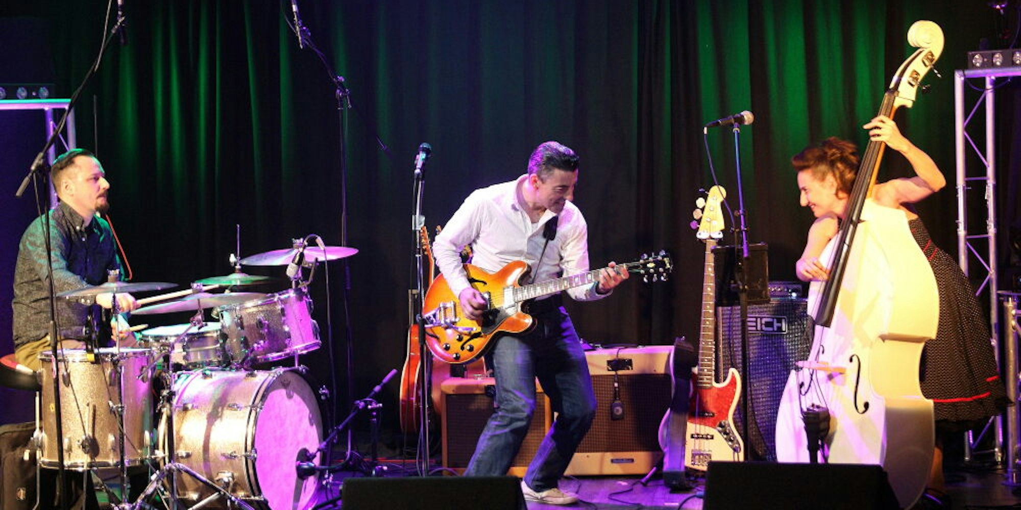 Endlich wieder vor Publikum aufzutreten – die Spielfreude war den drei Musikern anzusehen. Die Rockabilly-Surf-Pop-Hot-Jazz-Band um Bandgründer, Songwriter und Sänger Oliver Heydenreich, Drummer Martin Maurer und Angie Taylor an Bass und Kontrabass heizte der überschaubaren Anzahl an Gästen im Walzwerk, die Mundschutz trugen und weit voneinander entfernt saßen, richtig ein.