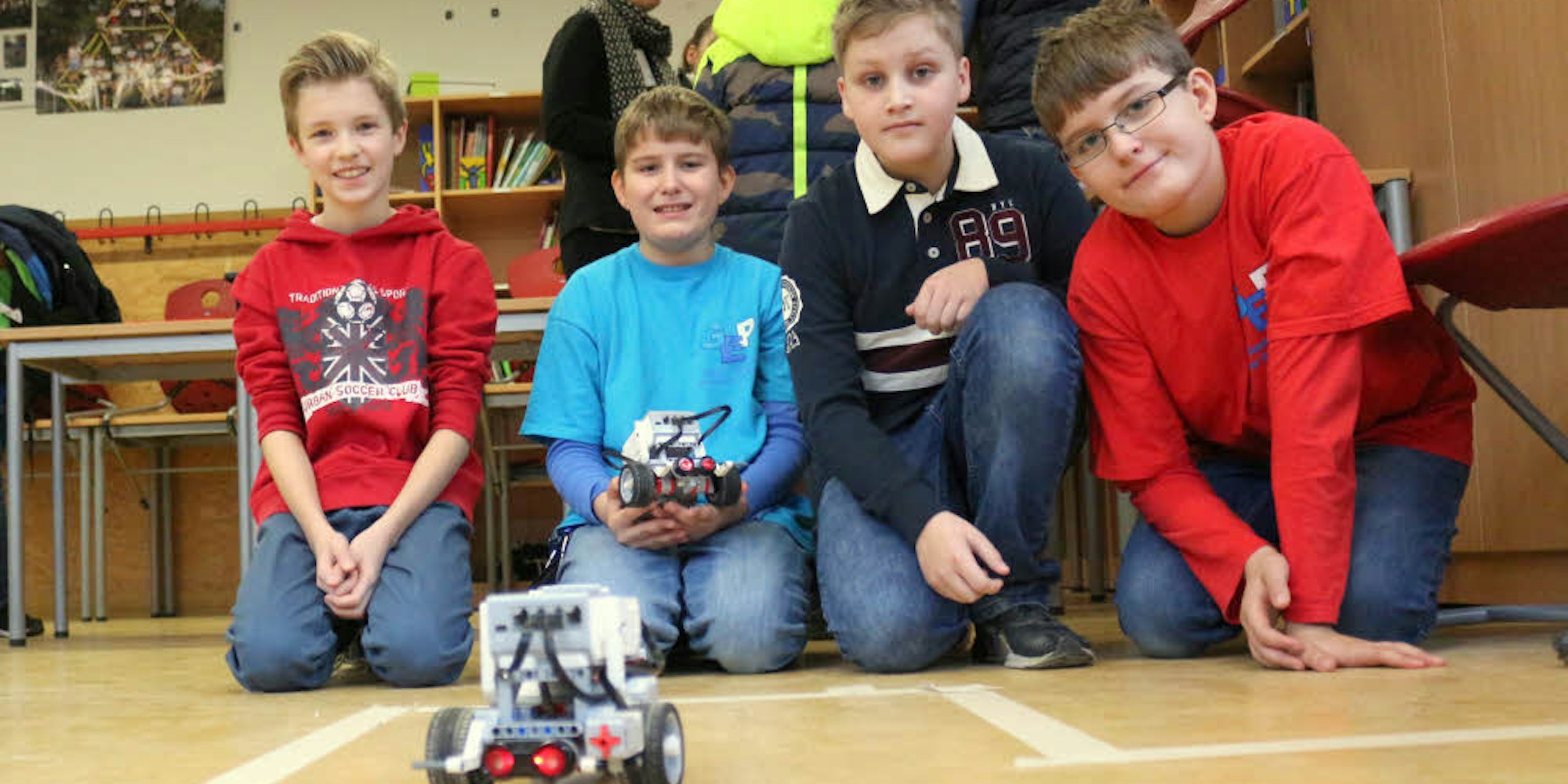 Jonas Jung (2. v. r.) gibt seine Kenntnisse an die Mitschüler weiter – sie programmieren gemeinsam Lego-Roboter.