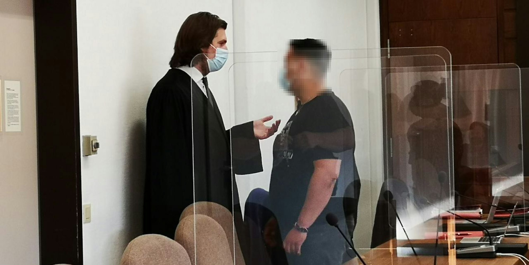 Der Angeklagte (r.) im Gespräch mit seinem Anwalt.