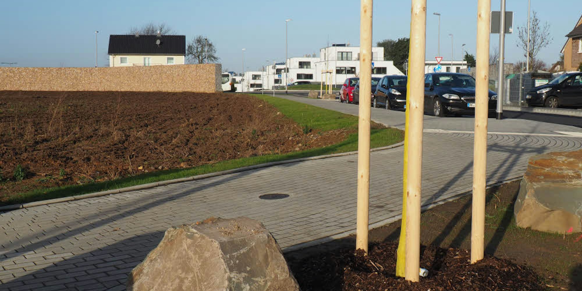 Dazwischen sind Parkplätze angelegt worden. Eine weitere Zufahrt führt von dem neuen Kreisel an der Geyener Straße/ Am Bendacker in das Planetenviertel.