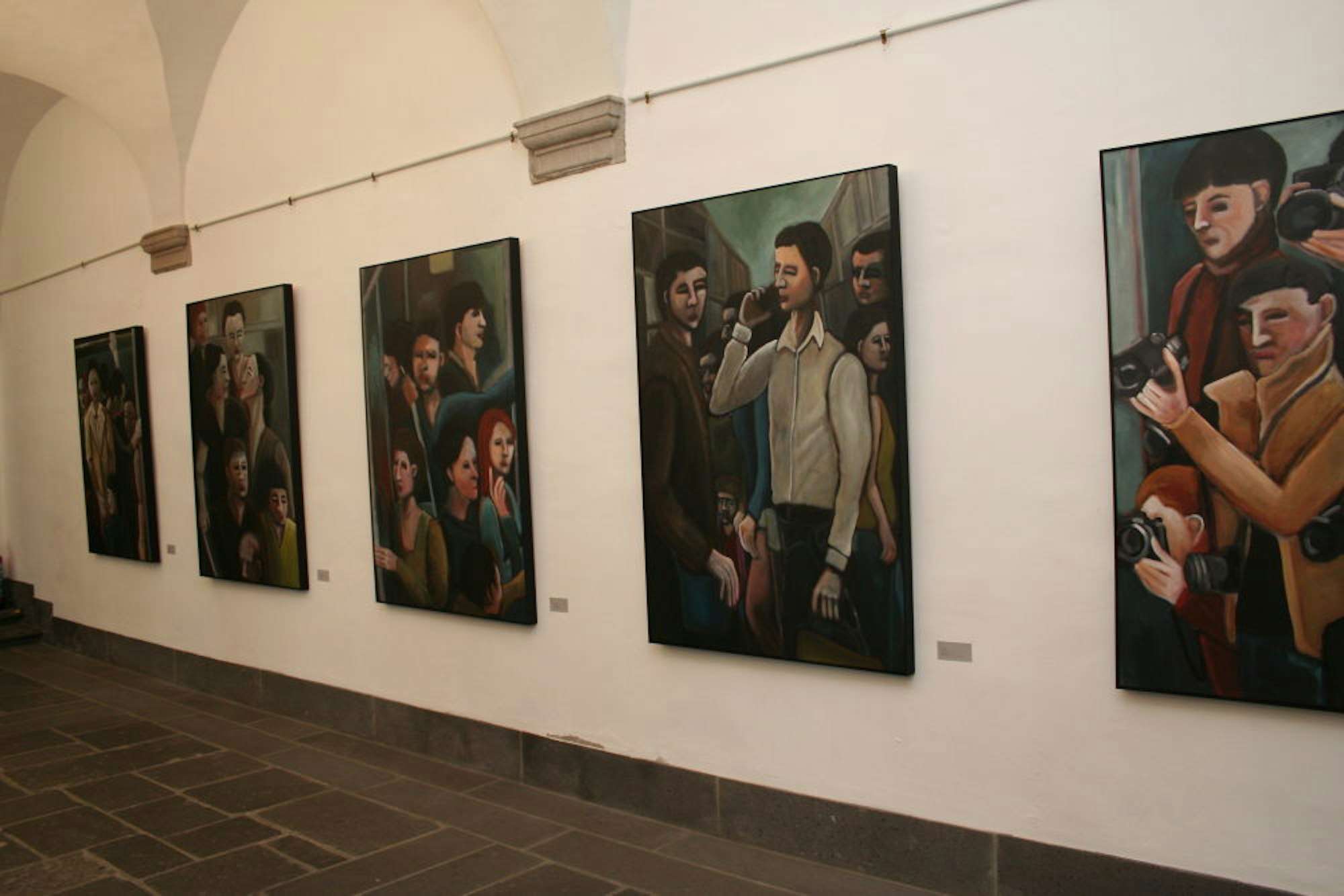 Die Abtei fordert ohnehin Improvisationstalent und Flexibilität vom Team des Kulturamts wie von den Ausstellern. Mal sind Lichtschalter oder Sockel im Weg, sodass Bilder nicht geplant gehängt werden können, mal darf das Schild, das auf den Feuerlöscher hinweist, nicht verdeckt werden. Benita von Wendt beweist Kreativität nicht nur bei ihren Bildern, sondern auch dabei, sie ins richtige Licht zu rücken: mit Stehlampen, deren Schein sie durch Joghurtbecher ohne Boden punktgenau platziert.