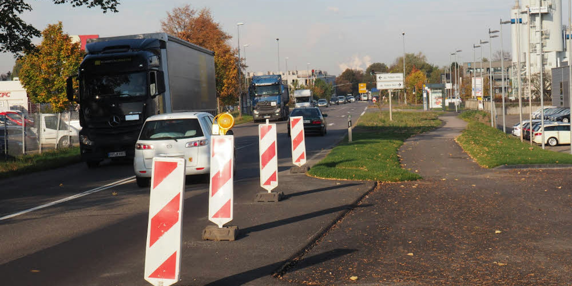Unstrittig ist dies: Der Rad- und Gehweg vor dem ehemaligen Knauber-Gelände an der Venloer Straße ist weiterhin gesperrt. Ein Umleitungsschild weist Radfahrern und Fußgängern den Weg vorbei an dem Einzel- und Großhandel Cardio Fitness, der Golfhouse-Filiale, dem Zweirad-Geschäft Kraft Rad und dem Autohaus BBA. Die Umleitung führt im weiteren Verlauf zurück auf die Venloer Straße, die eine Kreisstraße ist.
