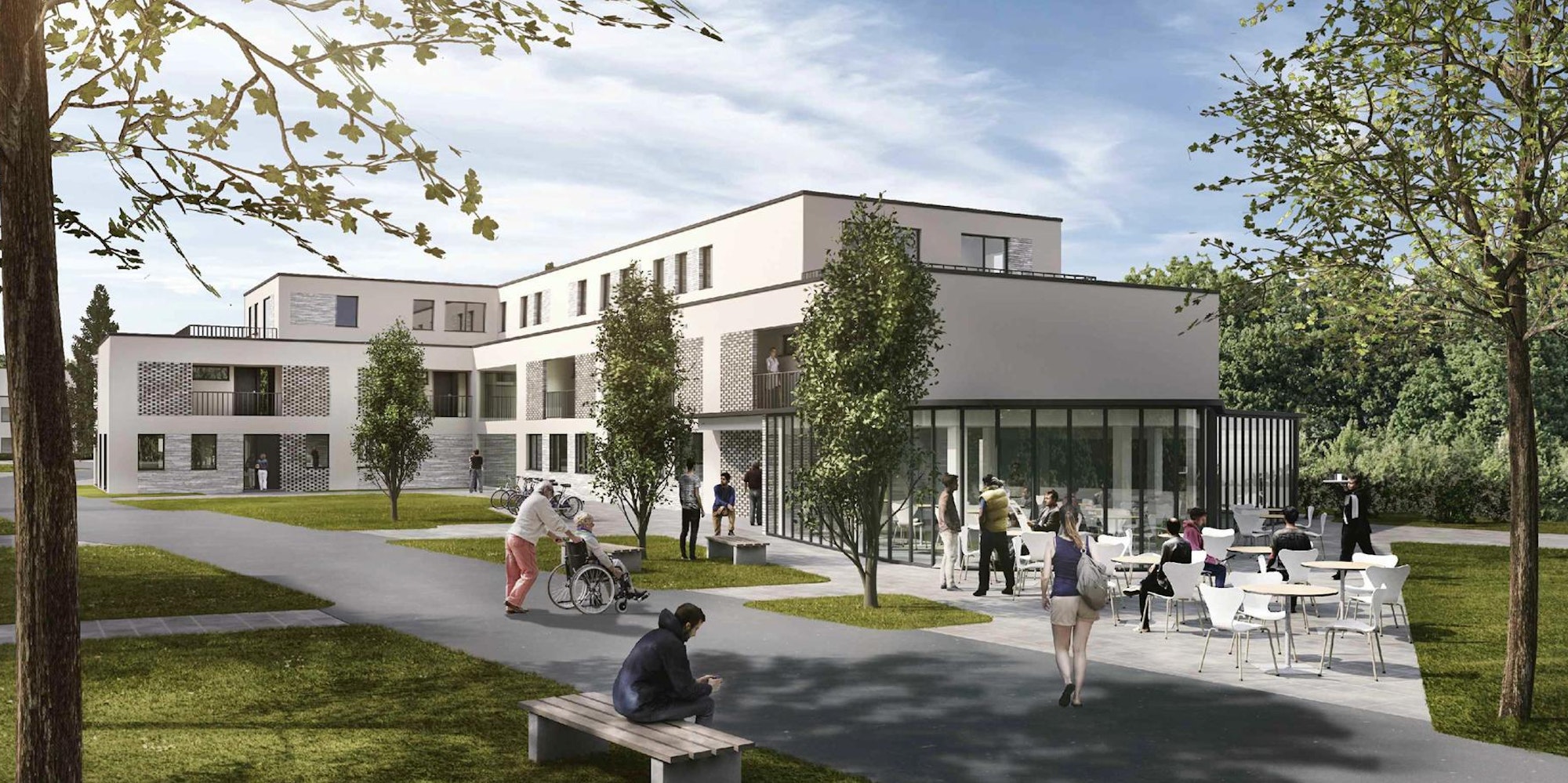 Die Pläne der Bauen für Menschen GmbH sehen an der Helmholzstraße ein inklusives Wohnquartier mit sieben Gebäuden und einer Tiefgarage vor. 57 Zwei- bis Vierzimmer-Wohnungen für Menschen mit und ohne Behinderung sind geplant. Sie alle sind barrierefrei, einige auch rollstuhlgerecht.