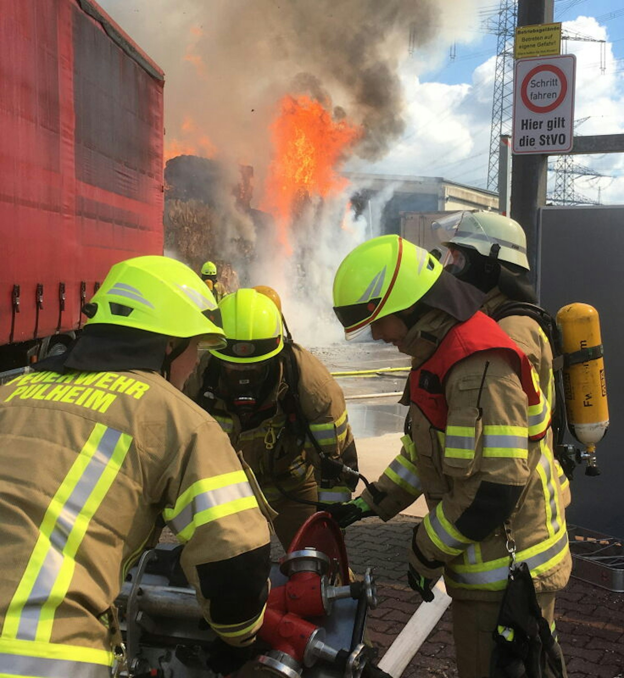 Der Leiter der Freiwilligen Feuerwehr Pulheim, Ralf Rahn: „Als wir eintrafen, brannten zunächst etwa 100 Ballen im vorderen Bereich des Firmengeländes.“ Ein Mitarbeiter der Firma hatte bis zum Eintreffen der Wehr versucht, die Flammen zu löschen. Dabei atmete er Qualm ein und wurde nach einer Untersuchung vom Notarzt mit Verdacht auf Rauchvergiftung ins Krankenhaus gebracht.