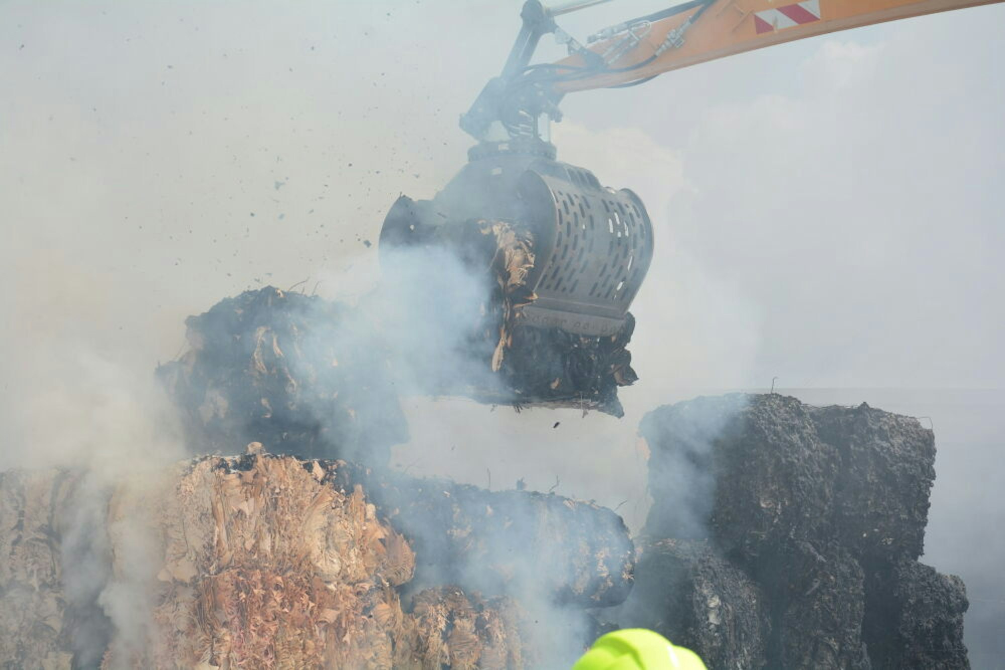 Mit Baggerschaufeln wurden die gepressten Papierballen auseinander gezogen.