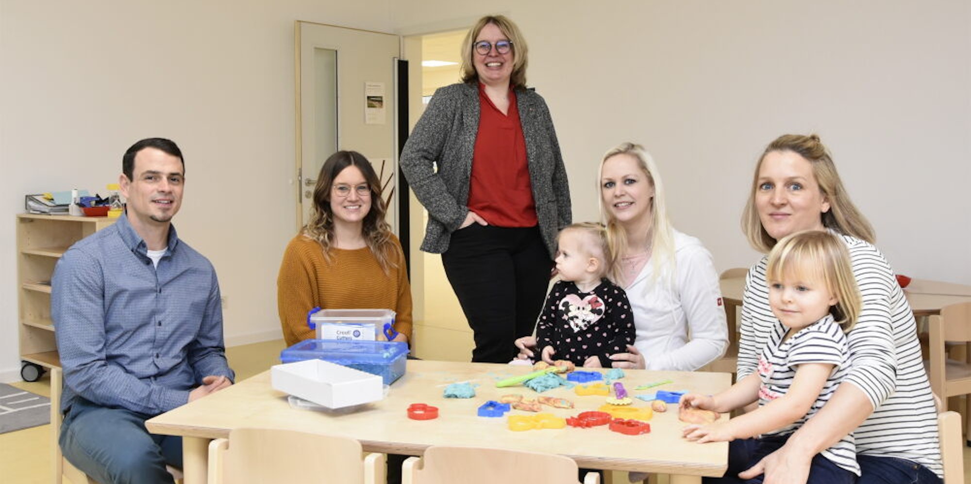 Über Wochen hat sich das Team auf die erste Begegnung mit Eltern und Kindern vorbereitet und die Räume für den Kitaalltag hergerichtet. Möbel rücken, Schränke und Regale einräumen, Spielsachen verstauen – das Team hatte alle Hände voll zu tun in dem Haus, das die GWG Rhein-Erft in nur wenigen Monaten in Holzbauweise errichtet hatte. In dem Gebäude gibt es ein Kinder-Bistro, in dem die Kleinen essen, einen Mehrzweck- sowie einen Kreativ- und einen Werkraum, ein Elternzimmer und einen Therapieraum. An den Start gehe die Kindertagesstätte zunächst mit 54 Kindern, aufgeteilt in vier Gruppen, sagt Dennis Schmitz. Am Ende wird sie Platz für 104 Mädchen und Jungen im Alter von vier Monaten in sechs Gruppen bieten. Pro Woche werden die Kinder 35 oder 45 Stunden betreut, geöffnet ist die Kita von 7.30 bis 16.30 Uhr.