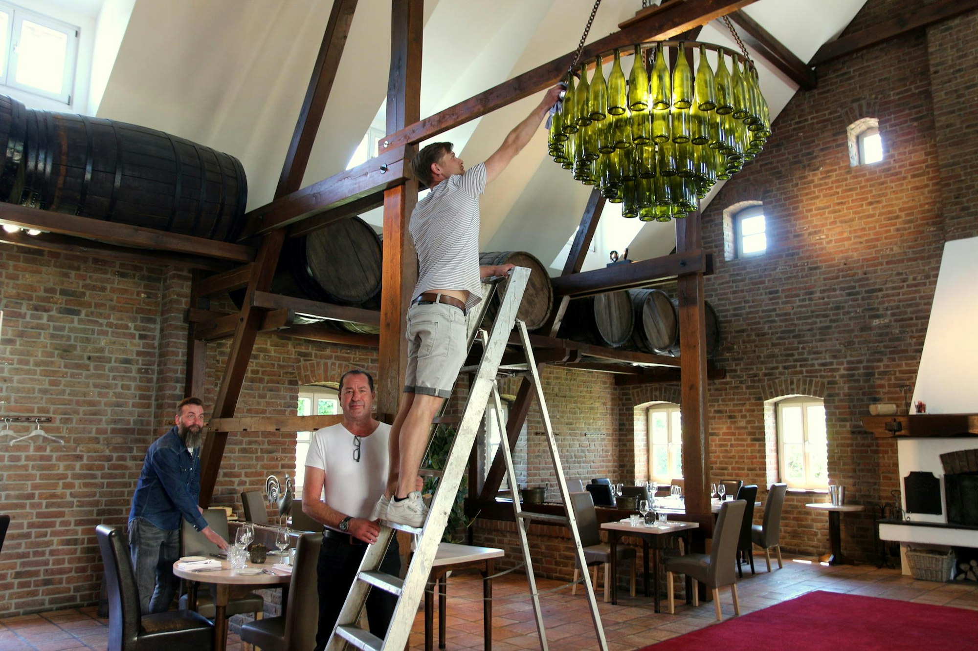 Herzstück des Restaurants zum Auerhahn ist der Kronleuchter aus alten Weinflaschen.
