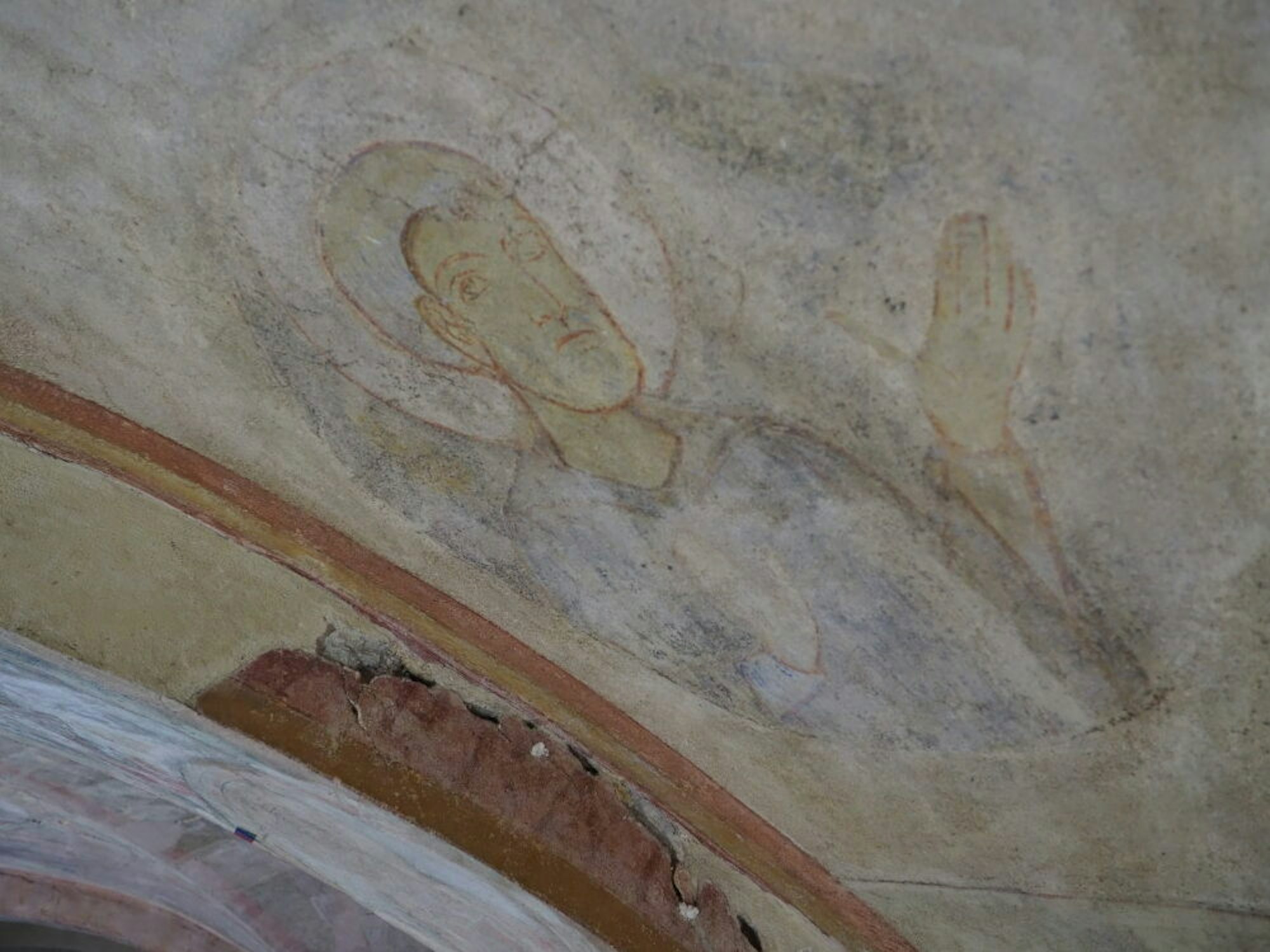 Tiefe Risse klaffen neben den Malereien, die Märtyrer, Heilige und Propheten zeigen.