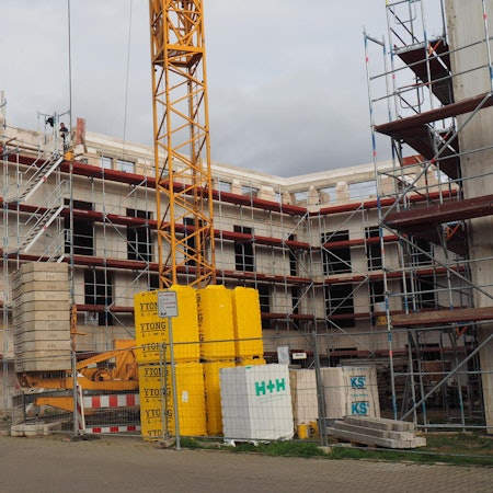 Aktuell schreite der Innenausbau voran, also der Trockenbau und die Rohinstallation der technischen Gebäudeausrüstung. Dazu zählen alle im Haus installierten Anlagen und Einrichtungen, die zum Wohnen notwendig sind beziehungsweise den Wohnkomfort steigern. Außerdem seien die Arbeiten an der Dachabdichtung im Gange, das Wärmeverbundsystem werde installiert. „Daneben finden die vorbereitenden Maßnahmen für den baldigen Beginn der Innenputz- und Estricharbeiten statt“, teilt der Sprecher mit.