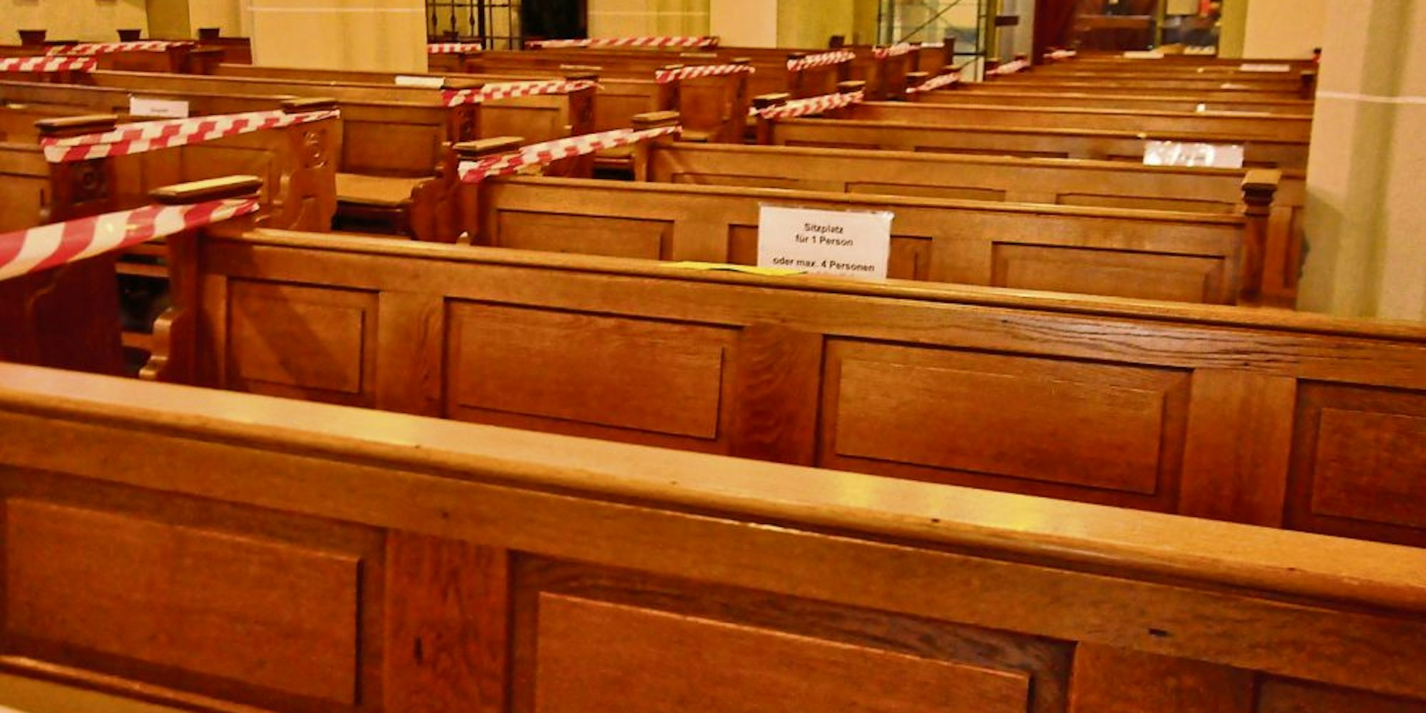 Mit Flatterband und Pfeilen für die Laufwege, hier in der Bergheimer St.Remigius-Kirche, finden wieder Gottesdienste statt.