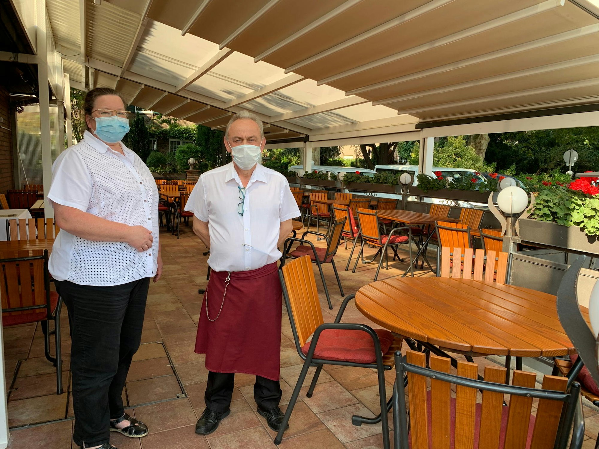 Monika Brackhane, Rezeptionistin, und Goran Begonja, Kellner, vom Breitenbacher Hof in Hürth