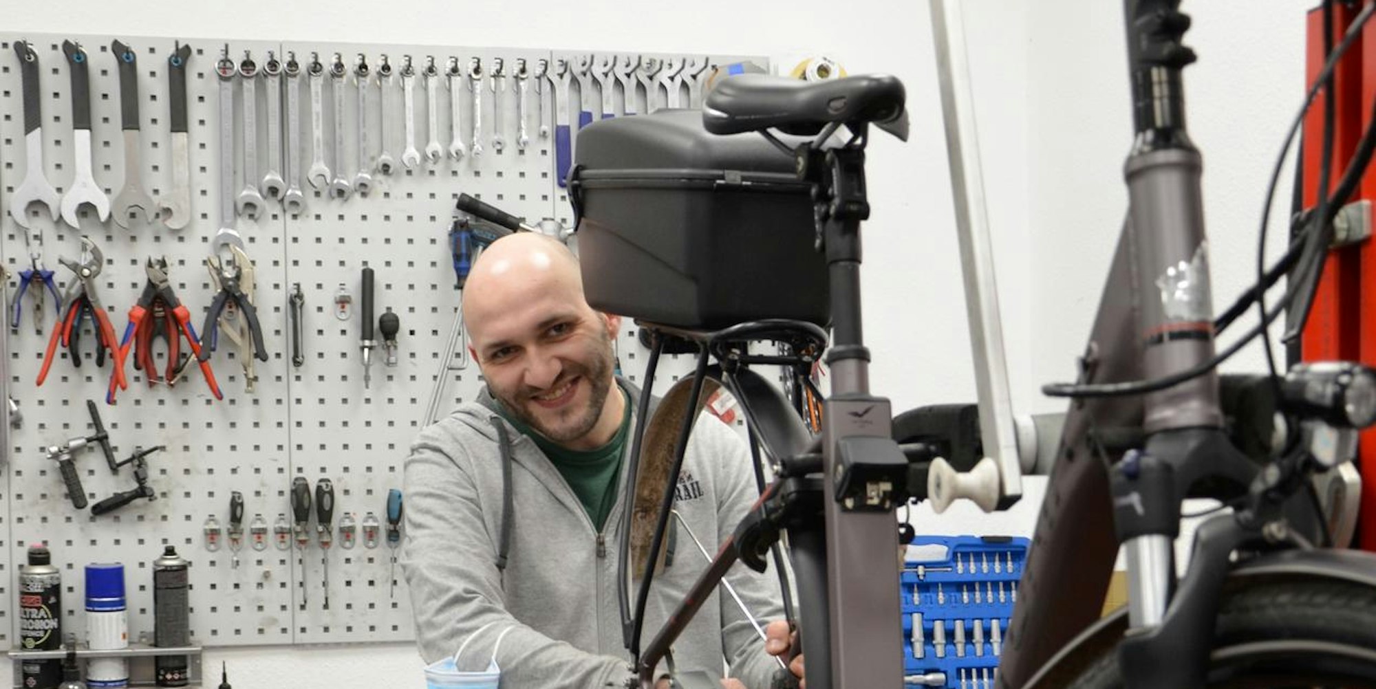 Rainer Braun ist Monteur im Erftstädter E-Bike-Geschäft „Antrieb-E“. Er hat alle Hände voll zu tun. Bei dem schönen Frühlingswetter lassen viele Leute ihr Rad auf Vordermann bringen.