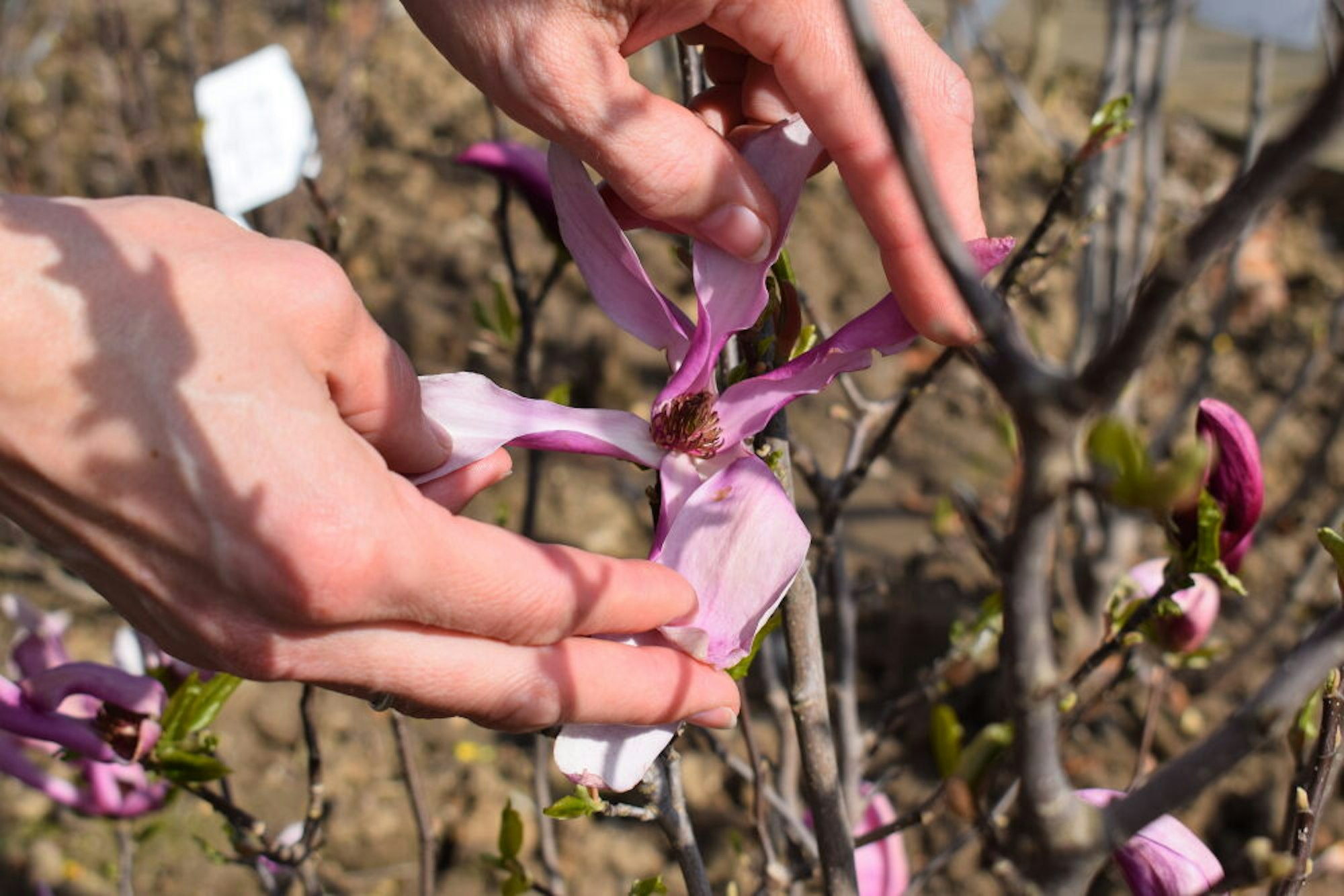 Anja Specht-Pitz arbeitet bei der Gartenbaumschule Hau an der Grenze von Brühl-Schwadorf und Bornheim-Walberberg. Die kalten Tage der letzten Woche haben einige Magnolienblüten leicht beschädigt und bräunlich zurückgelassen. Der Pflanze selbst tut das aber nichts, sagt die Gartenplanerin. Wer eine Magnolie im eigenen Garten will, muss vor allem auf die passende Art achten. Für den Vorgarten eignet sich etwa eine Sternmagnolie, die nur hüfthoch wächst und weiß blüht. Die klassische Magnolie hingegen, die jetzt überall ihre üppigen rosa Blüten öffnet, braucht bis zu fünf Meter Platz in Höhe und Breite. „Da wird es in den meisten Vorgärten schnell eng“, sagt Specht-Pitz. Schneiden sollte man die Magnolie auch nicht, und ihre Wurzeln vertragen Störungen wie Fräsgeräte schlecht.
