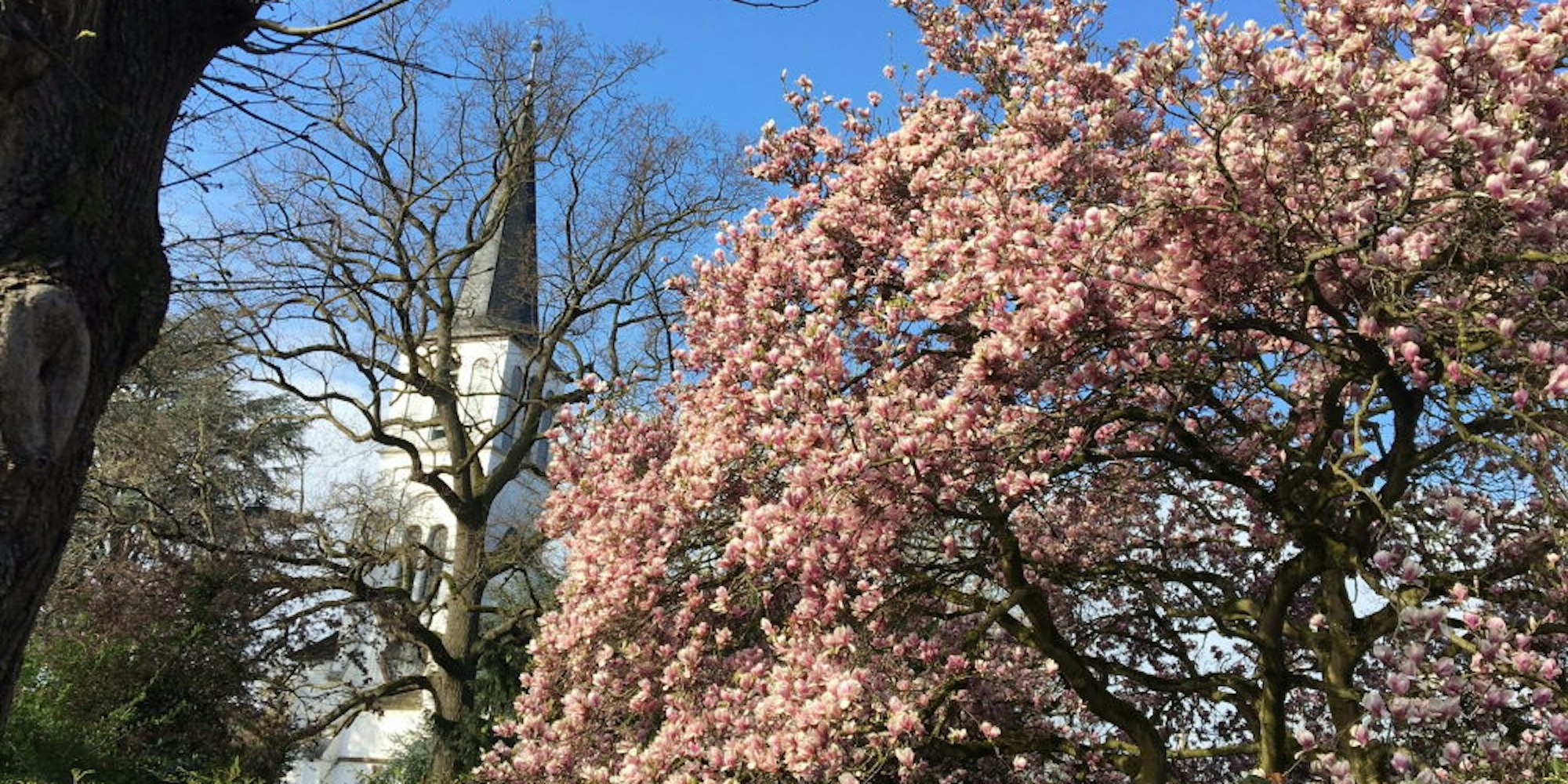 Unweit der Brühler Christuskirche steht eine große Magnolie derzeit in voller Blüte.