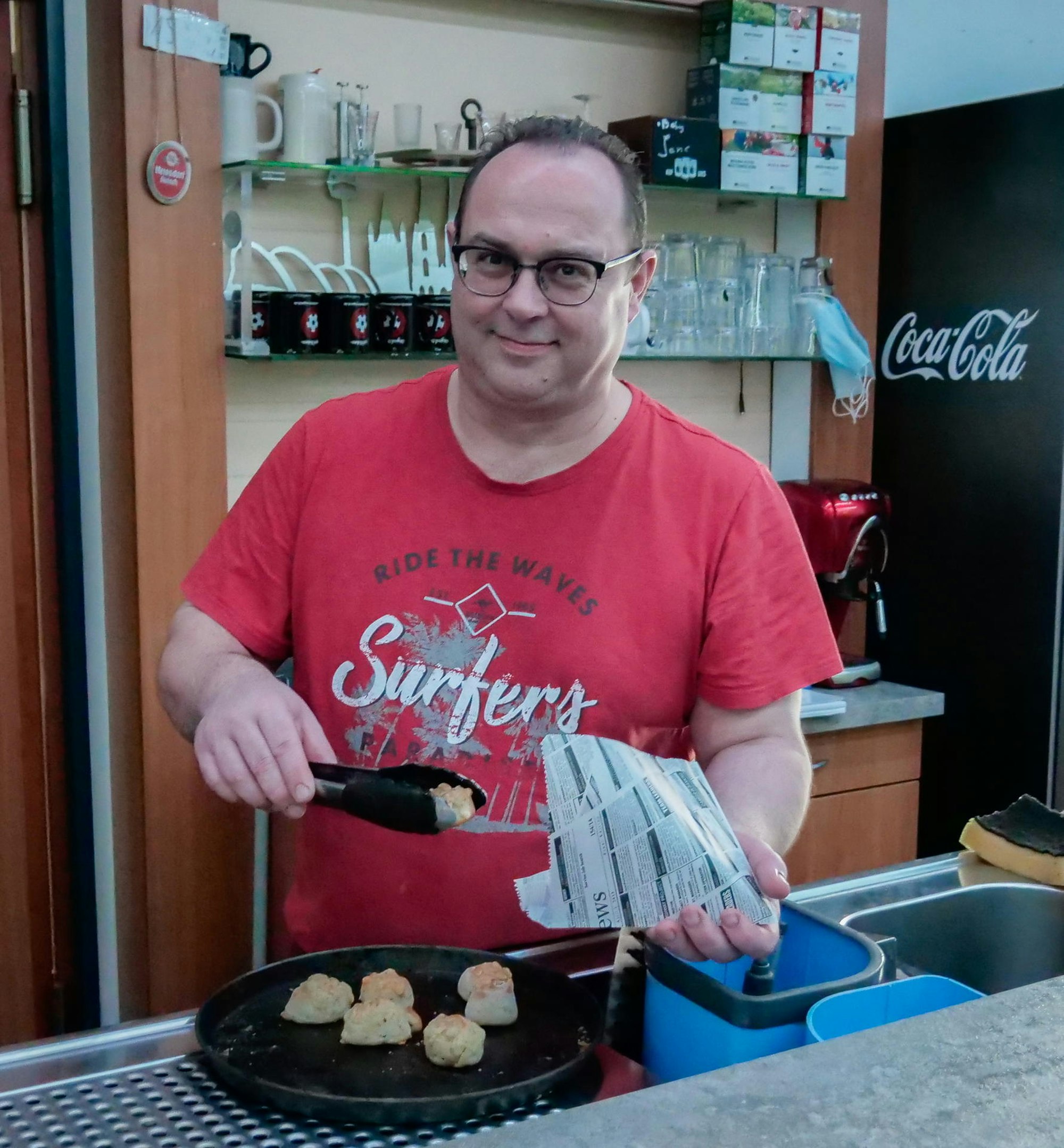 Ohne Aktive auf den Plätzen und Gästen auf Terrasse oder im Lokal versucht es Michael Kubiak mit Lieferservice, zu dem er Pizzabrötchen verschenkt.
