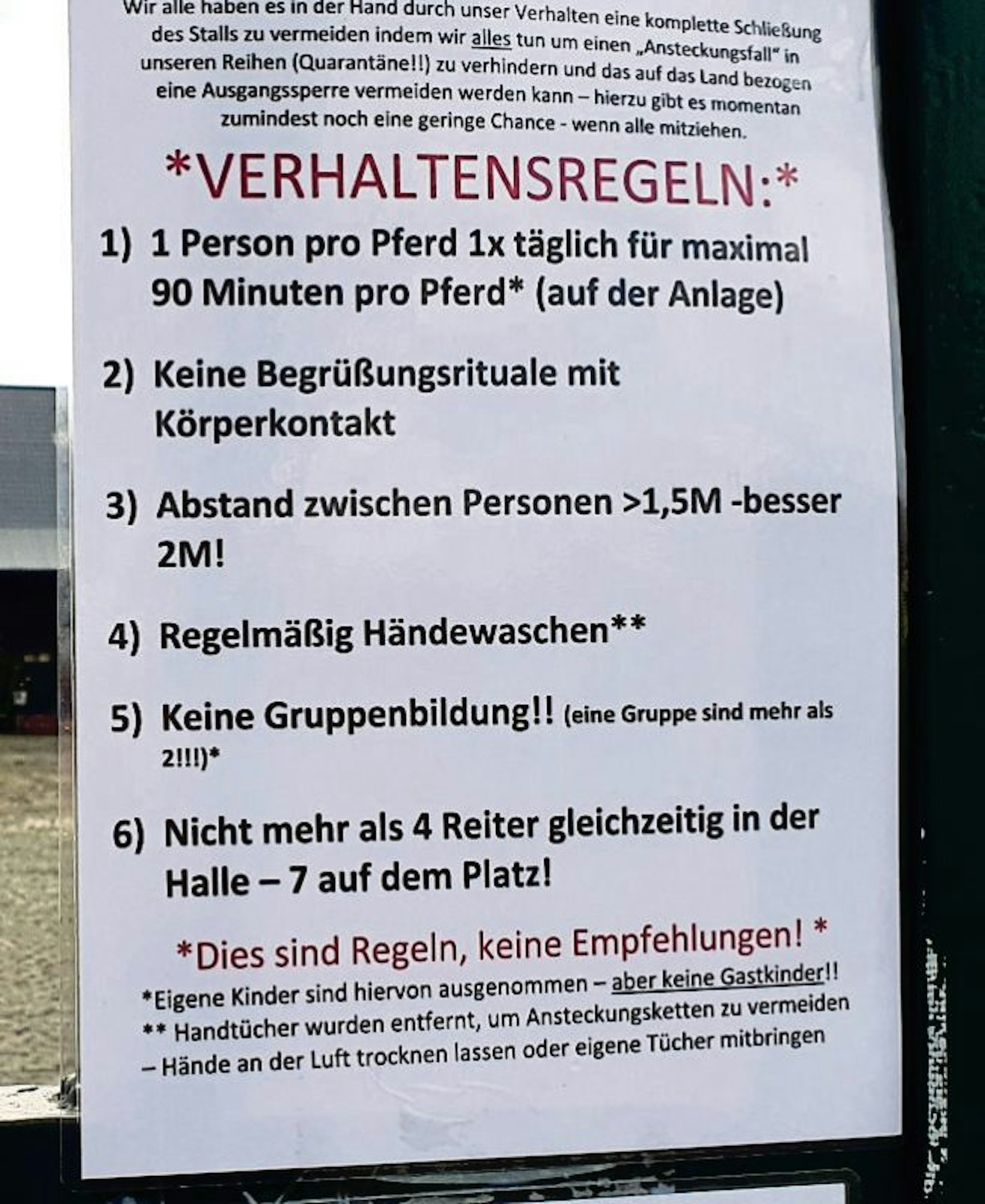 „Jeder Einsteller hat einen Brief mit der neuen Stallordnung bekommen“, berichtet Joseph Weber aus Erftstadt. Er führt den Freizeitstall Weber und ist FN-Mitglied. Die Regeln der Vereinigung findet er gut. Beschwerden habe er bisher nicht erhalten. Ganz im Gegenteil: Die Besitzer unterstützten sich gegenseitig und bewegen auch die Pferde der anderen mit, damit weniger Menschen auf dem Gelände seien. Die Reithalle sei aber für alle geschlossen. Und Tierarzt und Hufschmied müssten sich beim Chef ankündigen.
