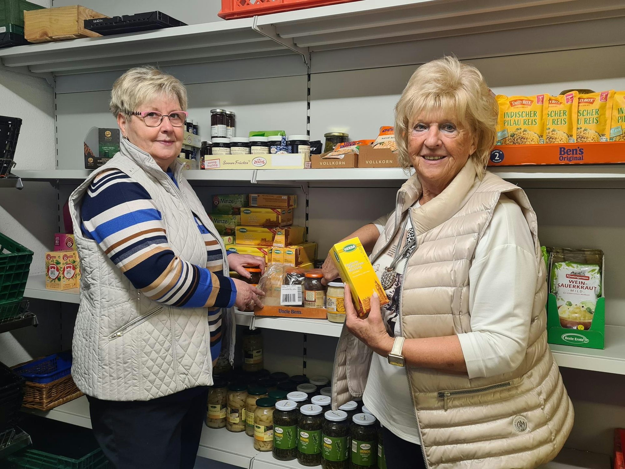 Hedwig Zander und Karin Breuer (r.) von der Bedburger Tafel räumen Regale ein. Noch reicht das Angebot aus.