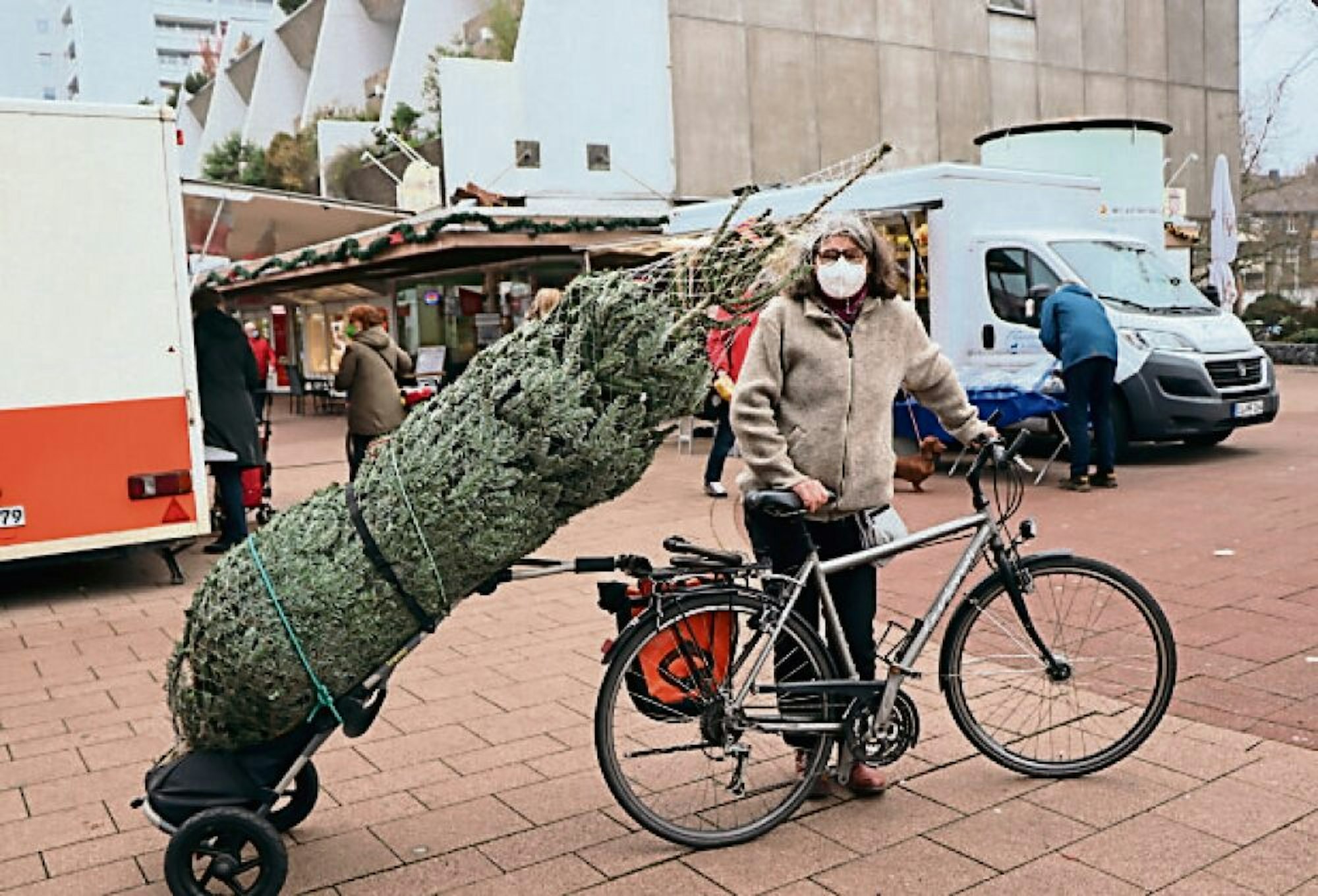 Null Stress hatte hingegen Simone Holderried (52) aus Bühl. „Wir schenken uns ja wirklich nur Kleinigkeiten, genießen aber umso mehr die Zeit des Zusammenseins“, sagte sie, als sie am Samstagmittag mit ihrem Fahrrad eines der wichtigsten Dinge für das Fest vom Brühler Wochenmarkt nach Hause brachte – den Weihnachtsbaum.