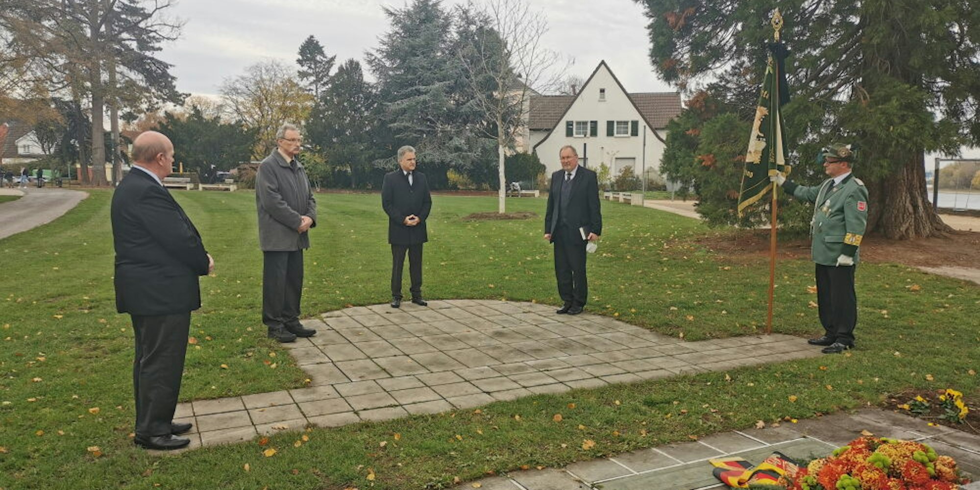 Zum Gedenken legte Bürgermeister Erwin Esser (SPD, Mitte) am Ehrenmal im Rheinpark einen Kranz nieder.