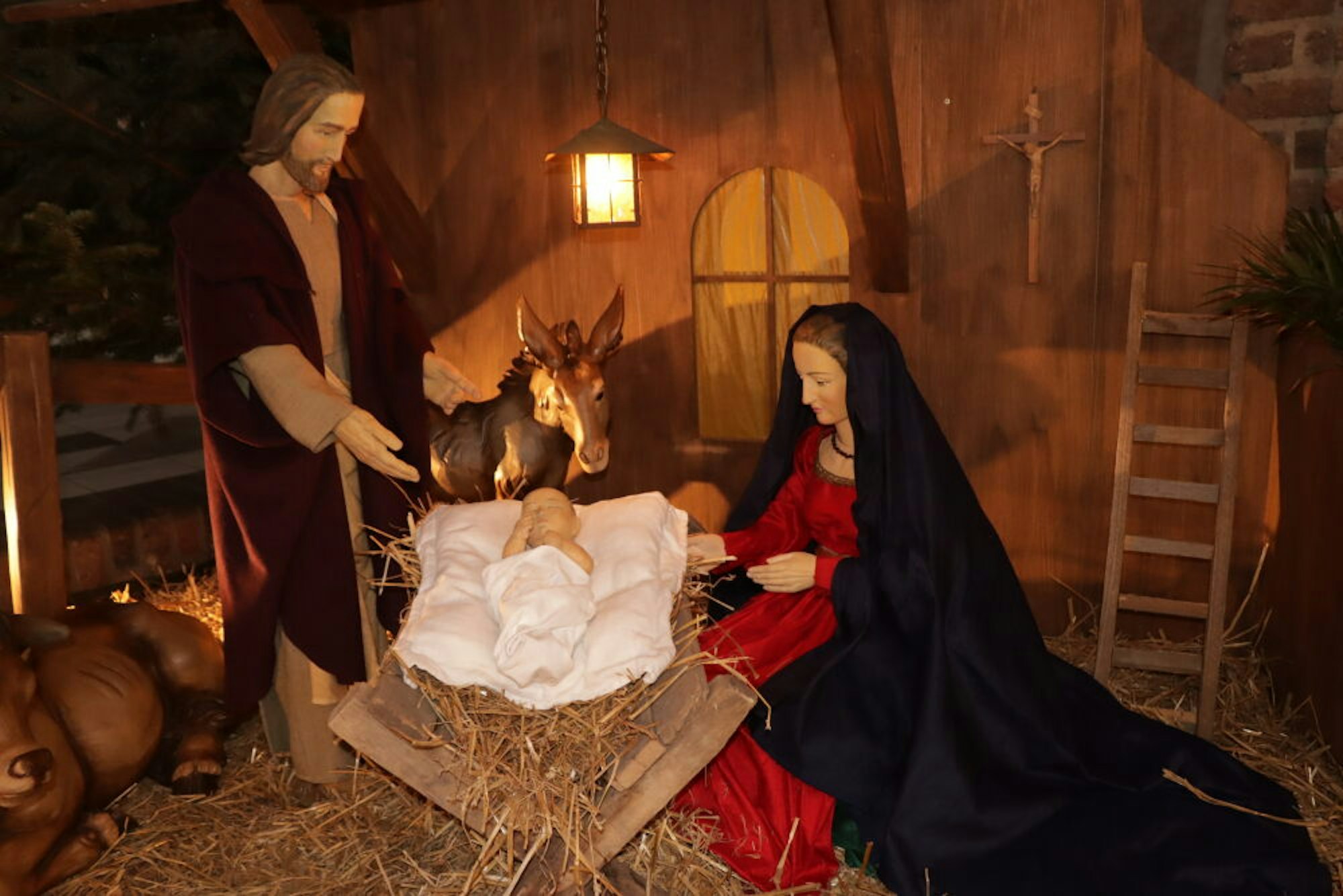 Im Zentrum der Krippe stehen Maria und Josef mit dem Christuskind in der Wiege aus Stroh und Holz.