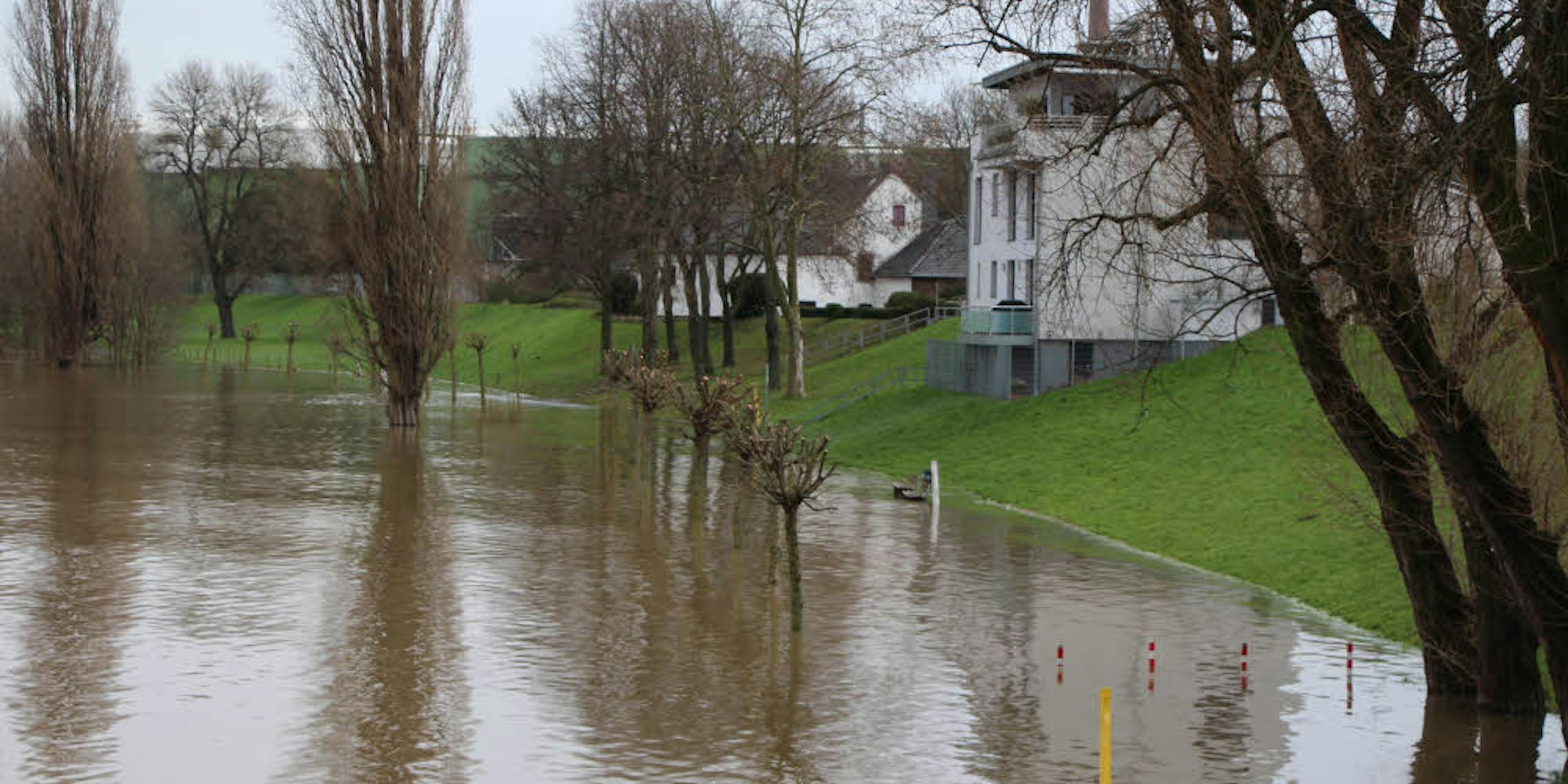 Land unter heißt es bereits auf dem Leinpfad in Wesseling Richtung Rheinforum.