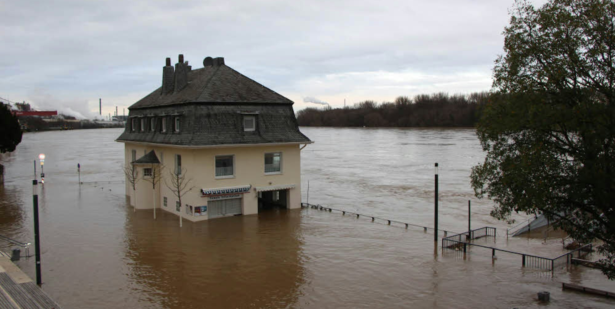 Völlig vom Rhein umspült ist das gelbe Haus im Wesselinger Rheinpark. Insgesamt betrachten die Experten die Situation allerdings recht entspannt.