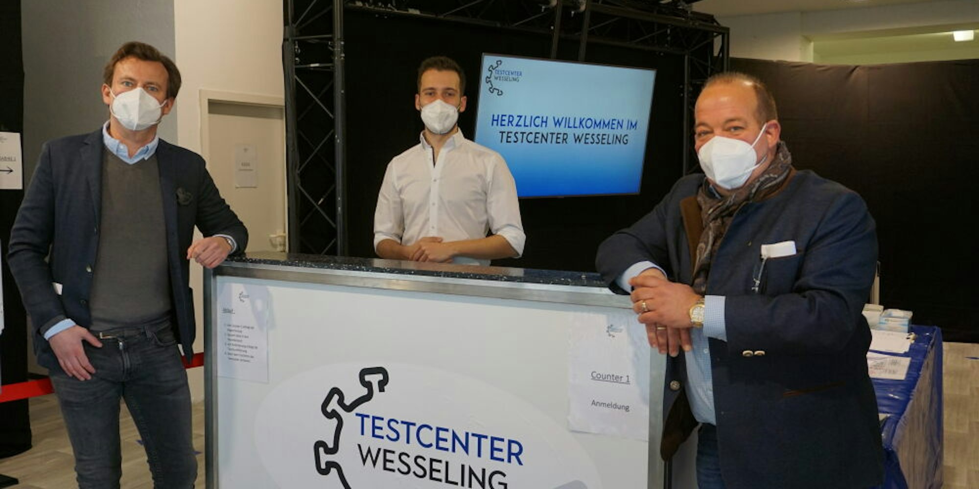 Die Arbeiten für die Eröffnung des Testcenters sind im vollen Gange. Am Frontdesk überwachen Johannes Krone, Stellenleiter Nikolas Diedenhofen und Holger Kaus (v.l.n.r.) die letzten Schritte.