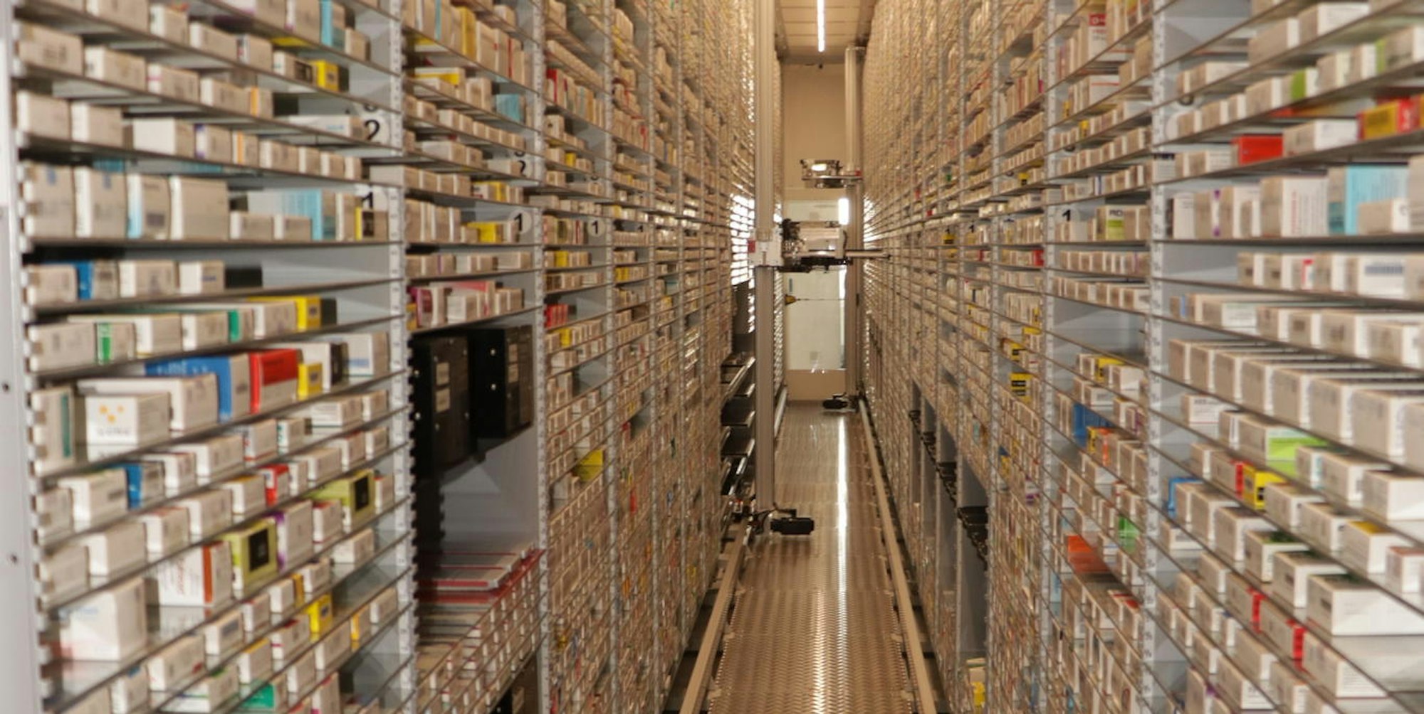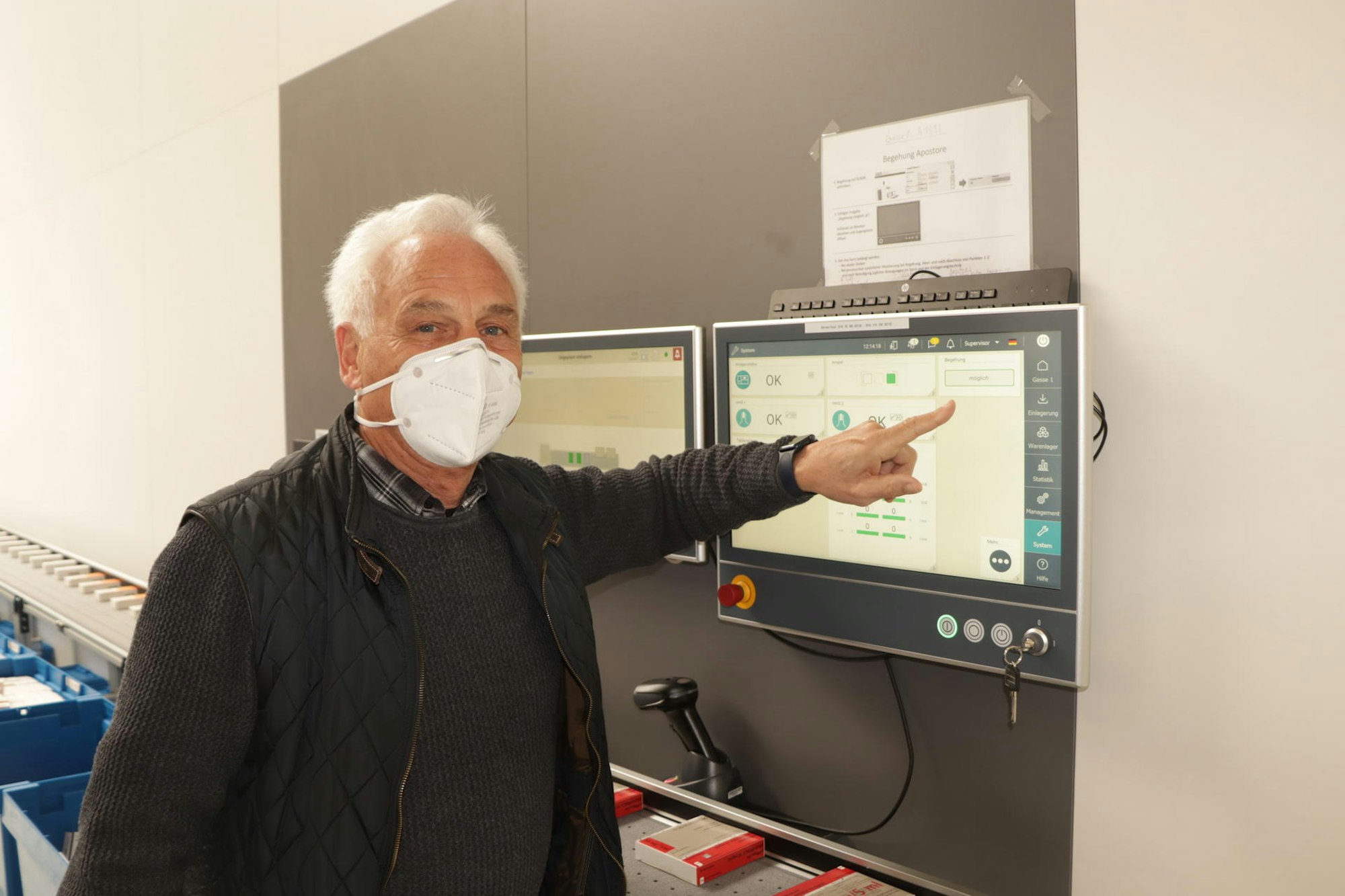Automatisch gingen die Medikamentenbestellungen der Krankenhäuser und Seniorenheimen bei ihnen im Versorgungszentrum ein. Bevor jedoch der Roboter die Listen selbstständig abarbeitet, kontrollieren die Mitarbeiterinnen und Mitarbeiter die Bestellungen und geben sie anschließend frei. Den Rest macht „Knapp-Store“. Wie ein Akrobat turnt er in seiner geschlossenen Behausung. Schnell und sicher greift er sich die jeweiligen Medikamente auch aus den allerhöchsten Regalen.