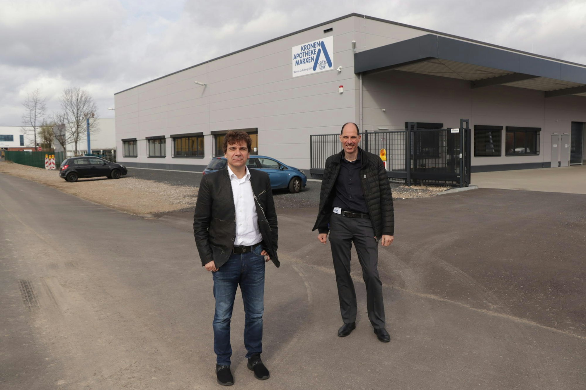 Die Apotheker Klaus Ruberg (r.) und Michael Marxen vor dem neuen Versorgungszentrum.