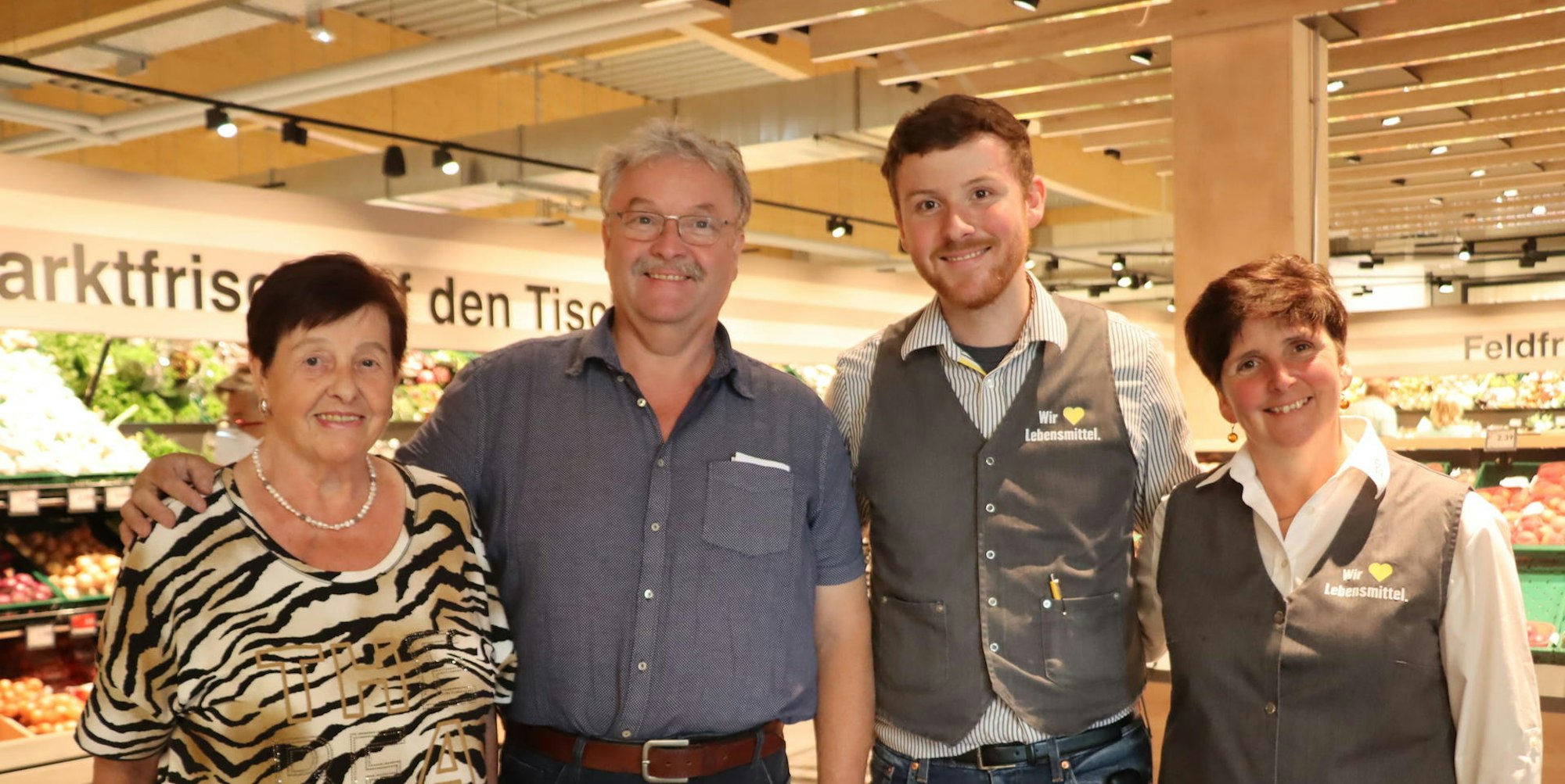 Familie Klein mit Oma Gerda Klein, Bauherr Thomas Klein mit Ehefrau Heike (r.) und ihrem Sohn Johannes Klein, der den Markt leitet.