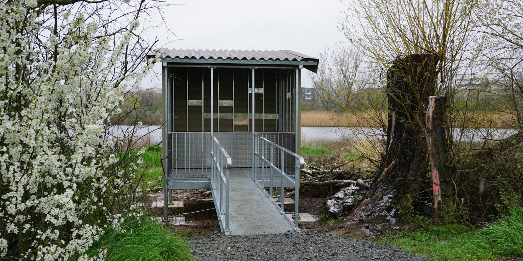 Die alte Vogelbeobachtungshütte wurde durch Brandstiftung zerstört, der Neubau besteht aus feuerfestem Stahl.