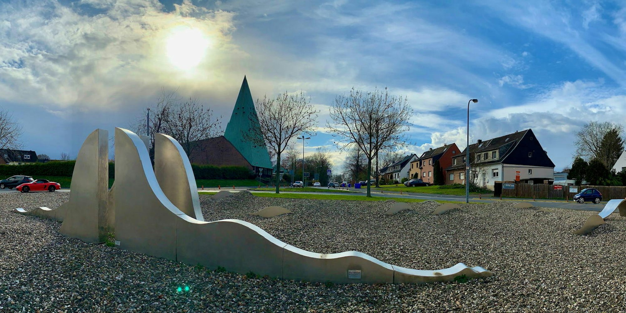 Mitten in der Stadt, an den Straßen Mühlenweg/Hubertusstraße, wurde der 41 Meter breite Kreisel gebaut. Gestaltet hat ihn der Künstler Wolfgang Göddertz im Jahr 2006. Schon seit 1995 steht die 1,5 Tonnen schwere Wellenplastik aus Edelstahl mitten auf dem Kreisel. Zehn Jahre lang war er umringt von Stiefmütterchen und Kugellampen, gepflegt von der Stadt. Für den Künstler ein unerträgliches Bild, wie er 2006 sagte. Er empfand es als „kitschig“, das rund um sein Kunstwerk ein kleinstädtischer Vorgarten angelegt wurde.