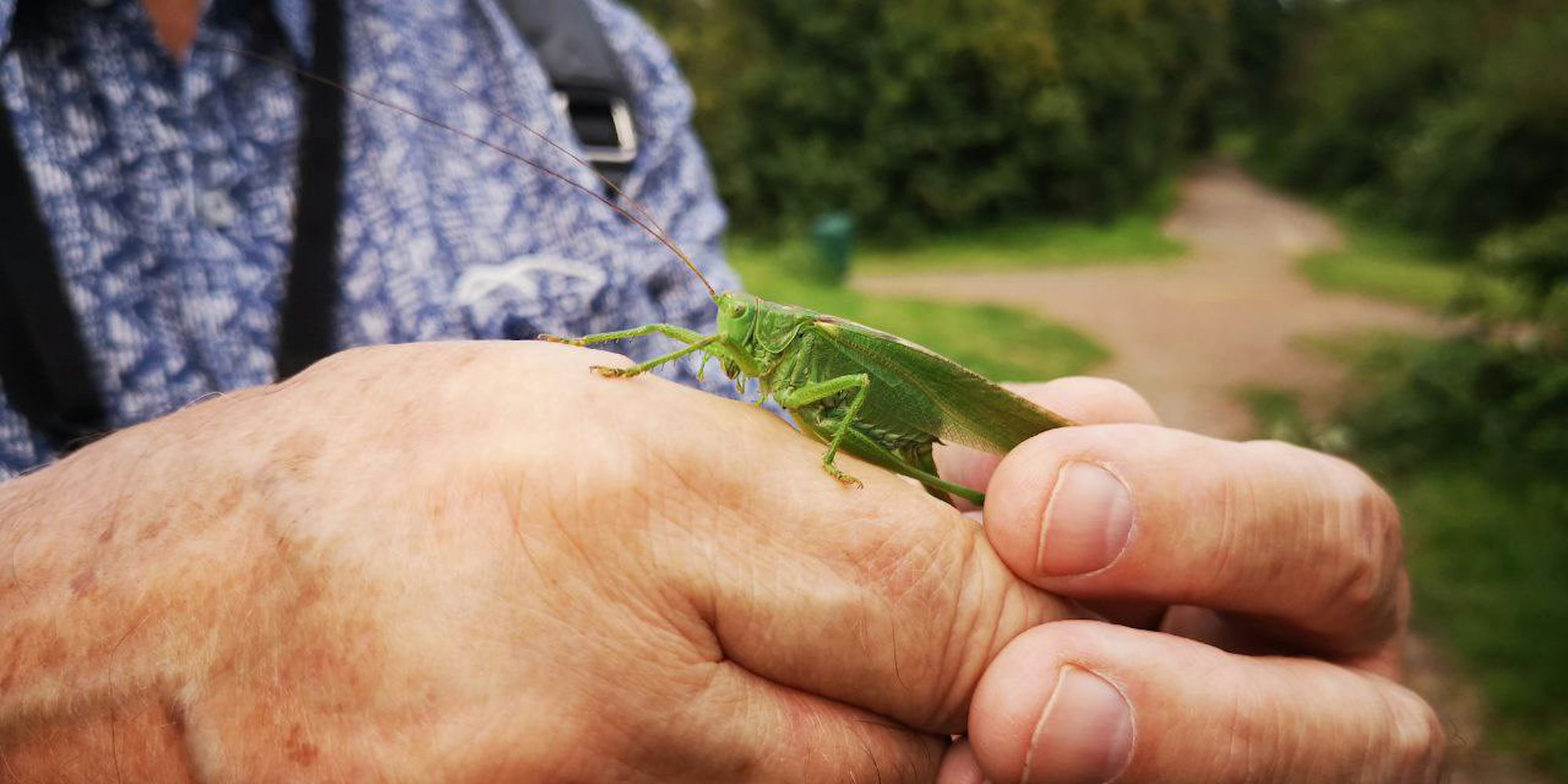 Ein grünes Heupferd begutachtet Exkursionsteilnehmer Hanno Schultz.