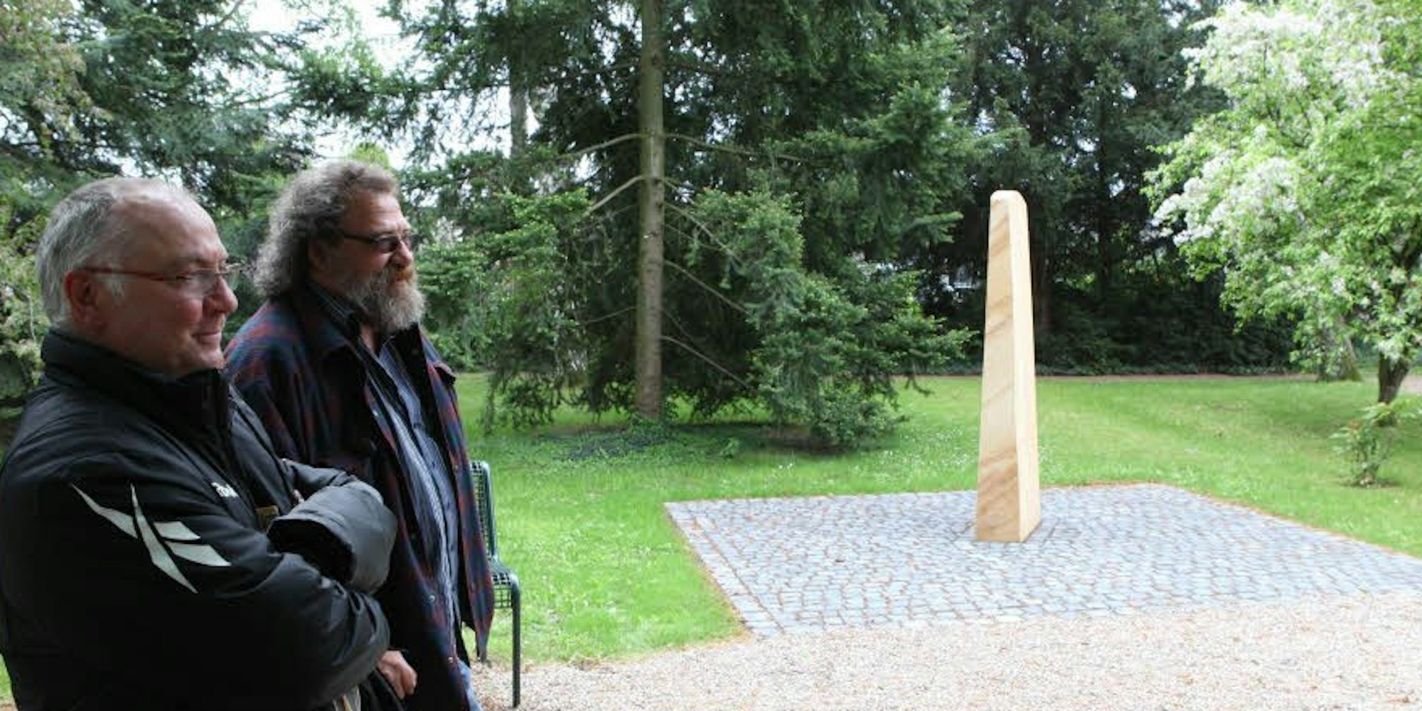 Eine Stele aus indischem Sandstein ziert den Ruhepark; Dietmar Neff (links) hat die Skulptur gefertigt, die in ihrer Maserung an Holz erinnert. Mit dabei: Friedhofsmeister Michael Hummel. (Foto: Mischka)
