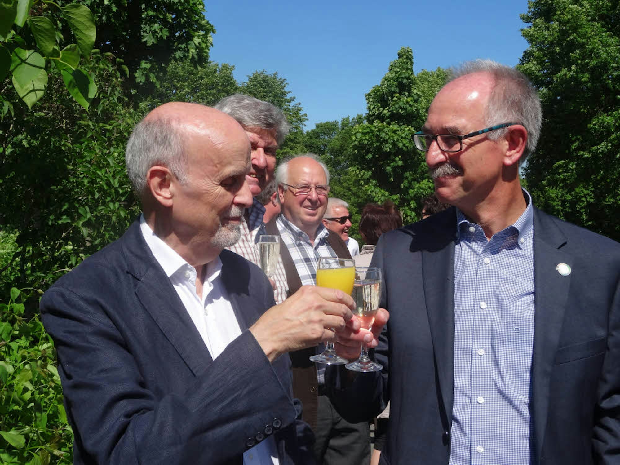 Mit René Böll (links) stieß Muchs Bürgermeister Norbert Büscher auf die neue Straße an.