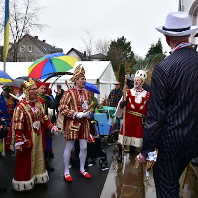 Nicht vom Schnaps gefärbt, liefen die Kamelle-Junkies auf. In tiefblauen Kostümen inszenierten sie die Unterwasserwelt und waren ein echter Hingucker. An Farbe übertroffen wurde dies freilich noch von der knatschbunten Entourage des Mucher Dreigestirns und der Dekoration seines Wagens. Für das Gefährt von Prinz Malcolm, Bauer Jürgen und Jungfrau Waltraut waren mehr als 2000 rote, blaue, gelbe und grüne Luftballons aufgeblasen worden.