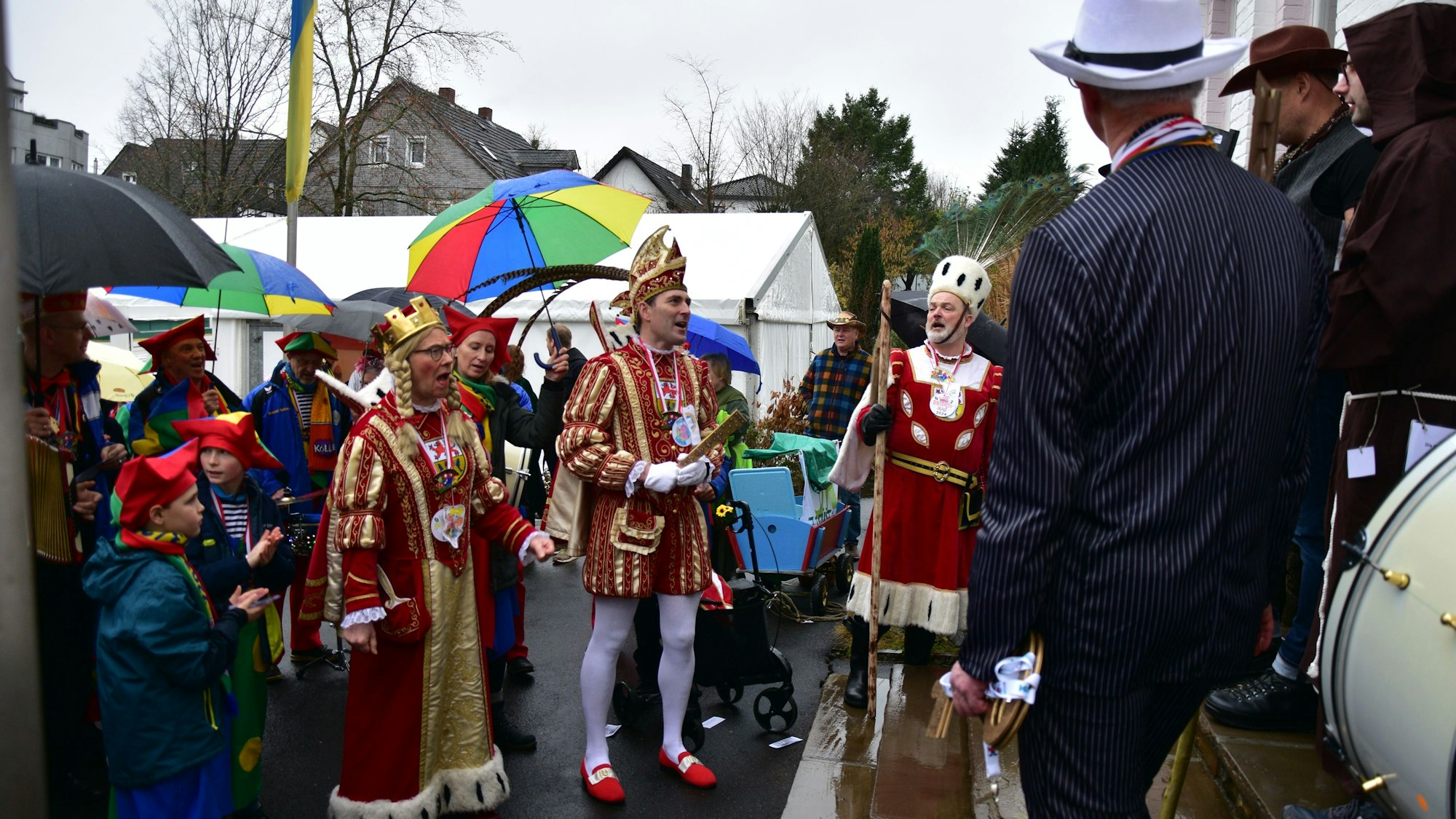 Die Jecken forderten die Gemeindeverwaltung zu einem Gesangswettstreit auf. Die Overheder Hoffsänger schmetterten den Bläck Fööss-Klassiker „Mer losse d'r Dom en Kölle“ in Richtung Rathauseingang, alle Schaulustigen sangen lauthals mit. Ein starker Einstand, wie Bauer Jürgen nach der Gesangseinlage betonte: „So jetzt seid ihr dran!“