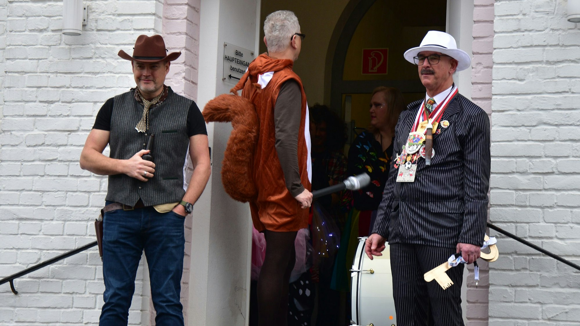 Bürgermeister Norbert Büscher stand schon ehrfürchtig mit dem Rathausschlüssel in der Hand auf der obersten Stufe vor dem Eingang, als das Dreigestirn der Overheder Hoffsänger samt Gefolge den Rathausvorplatz betrat. Neben dem Bürgermeister steht der erste Beigeordnete Karsten Schäfer mit breiter Brust, Cowboy-Hut und Colt, die Gemeinde-Mitarbeiter hinter ihnen verstopfen selbstbewusst den Eingang. Sie scheinen bereit, um den Jecken die Stirn zu bieten.