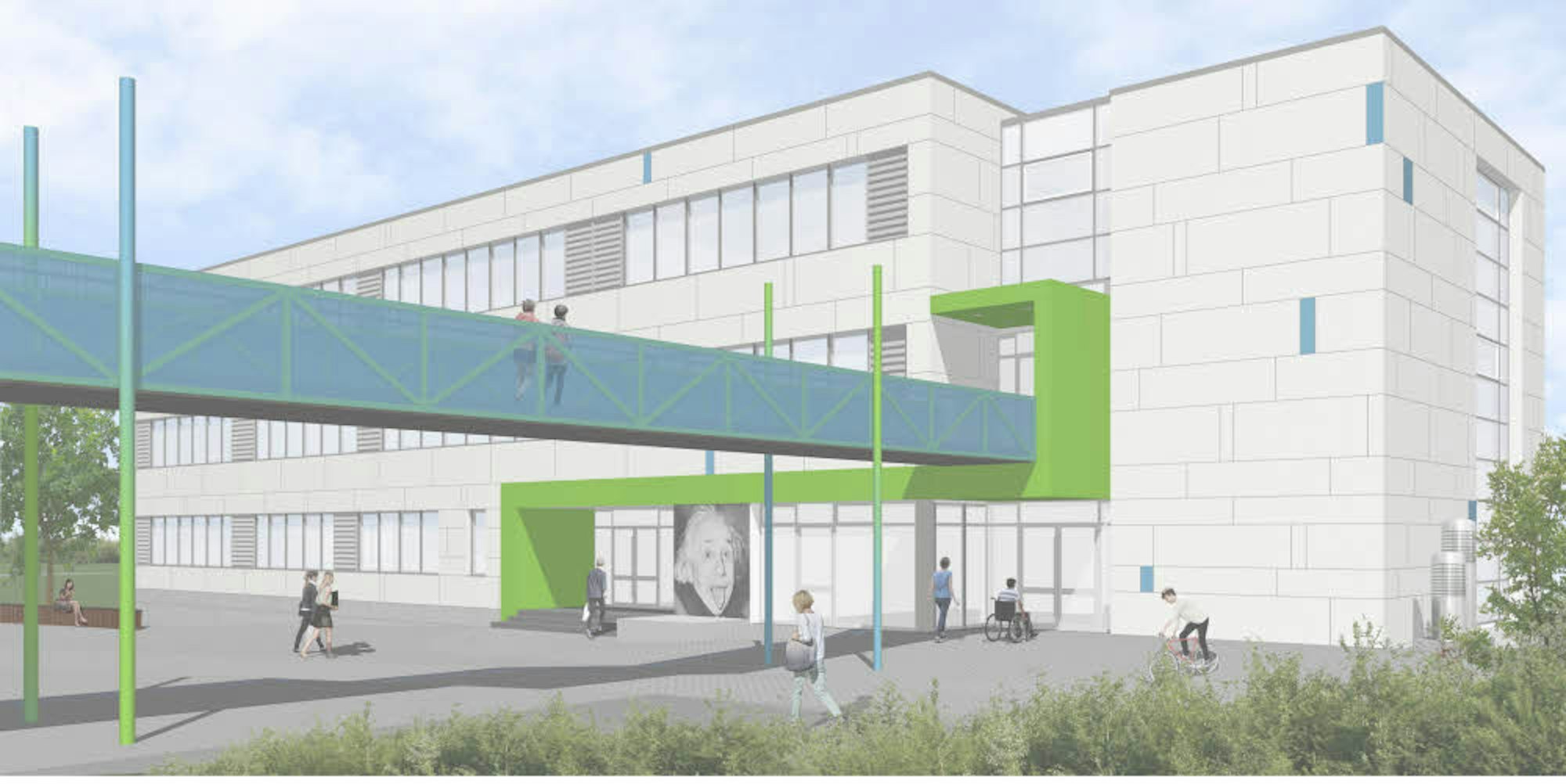 Neben Klassenzimmern für die vierzügige Oberstufe der Schule sollen auch neun Räume für den naturwissenschaftlichen Unterricht in dem Gebäude unterkommen. Dazu entstehen auf 5155 Quadratmetern Fläche vier Geschosse in Stahlbetonbauweise, die auch Platz für eine Halle, ein Selbstlernzentrum, einen Teamraum und ein Schülercafé bieten. Später kommt eine Verbindungsbrücke zum Haupttrakt der Schule hinzu.