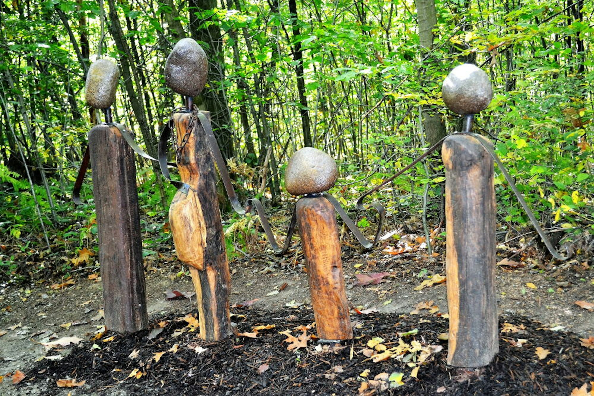 Much – Eine Familie aus vier lebensgroßen Holzskulpturen, zusammengehalten von einem starken Eisenband. Das Kunstwerk von Friedhelm Schlimbach ist eine von zwölf Stationen, die entlang der Strecke von der Fatima-Kapelle in Much bis zum Aussichtspunkt „Blaue Bank“ am Bestattungswald „Waldruhe“ zu finden sind. Entwickelt wurde dieser „Pfad der Erinnerung und der Zuversicht“ vom ambulanten Hospizdienst Much.