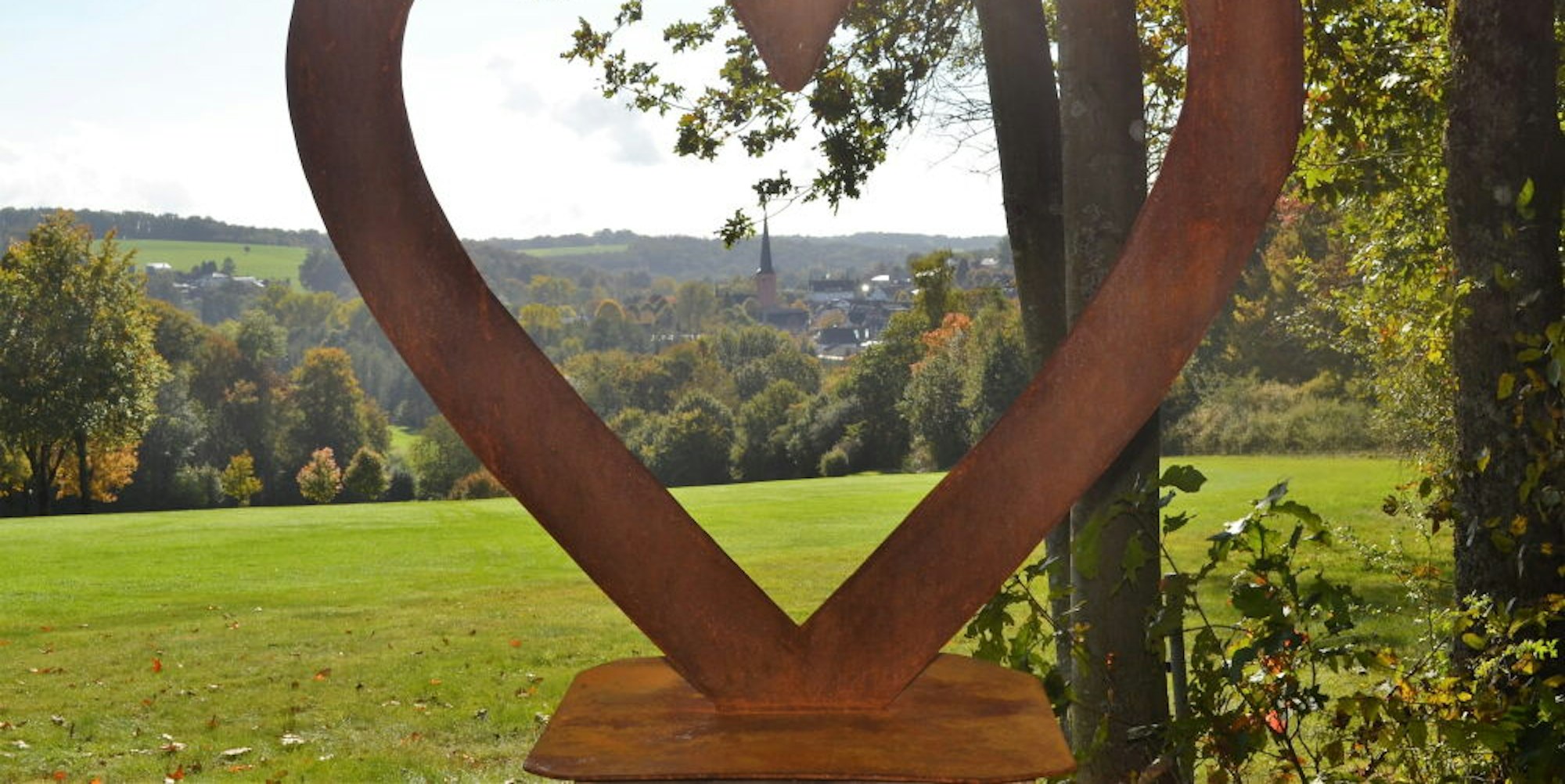 Ein markantes Eisenherz rahmt den Blick auf den Mucher Kirchturm – eine Arbeit der Lebensgemeinschaft Eichhof.