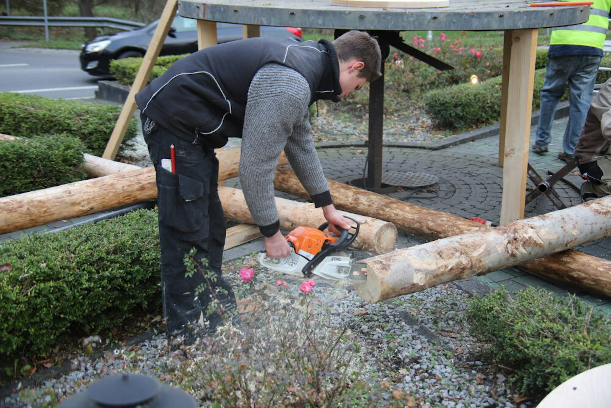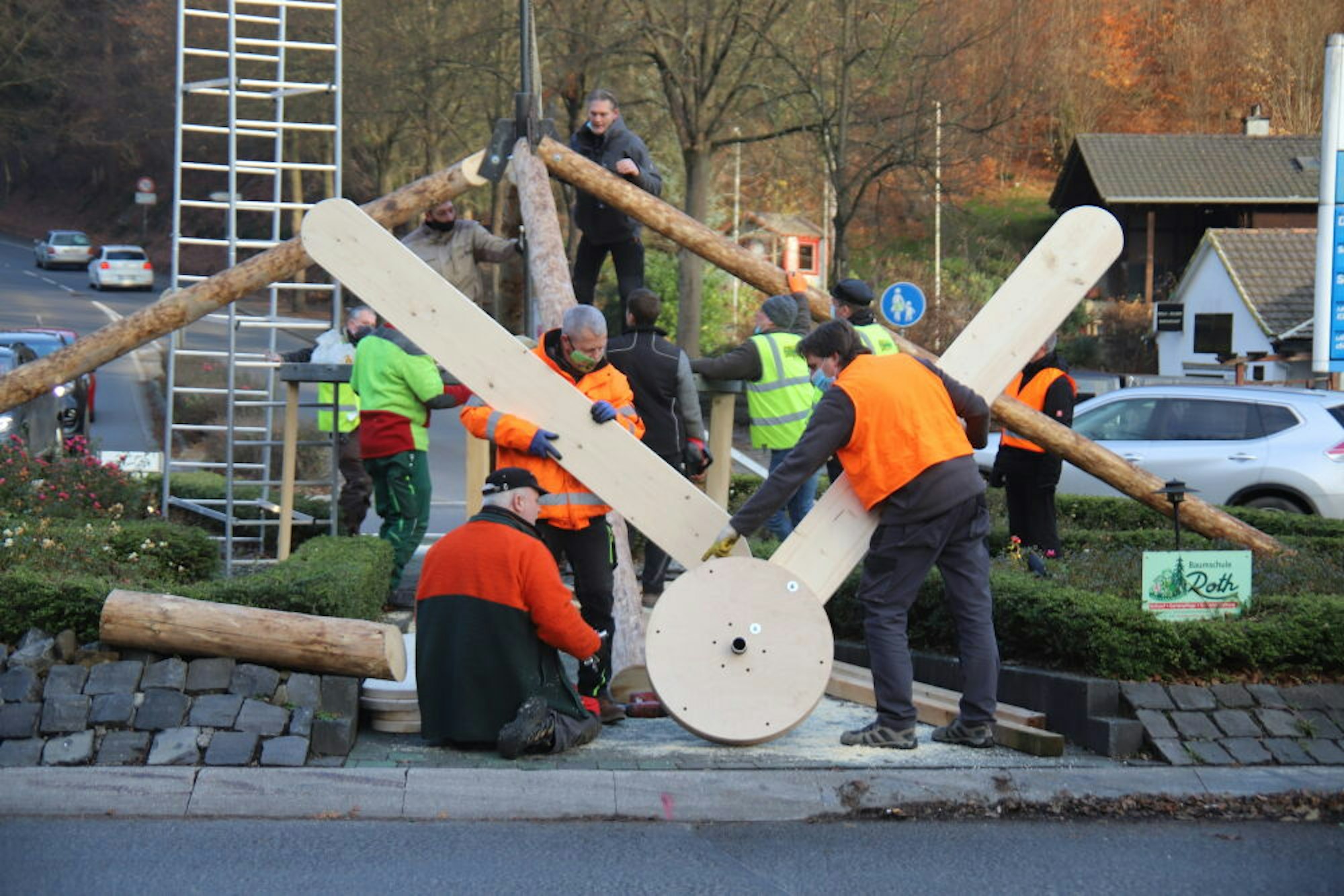 Von der Stange gibt es so etwas natürlich nicht. Also hatten die Konstrukteure zwei runde Holzplatten ausgesägt, zwischen die die sechs selbstgefertigten Flügel gesteckt und festgeschraubt werden konnten. Eine Kleingruppe nahm sich diese Arbeit vor, auf engstem Raum mussten die Helfer ran, konnten sie den wichtigen Kreisverkehr doch nicht während der ganzen Bauzeit komplett sperren. Das Timing passte. Während die andere Truppe die Bäume aufstellte und die Stange ausrichtete, wurden sie mit der Bekrönung fertig.